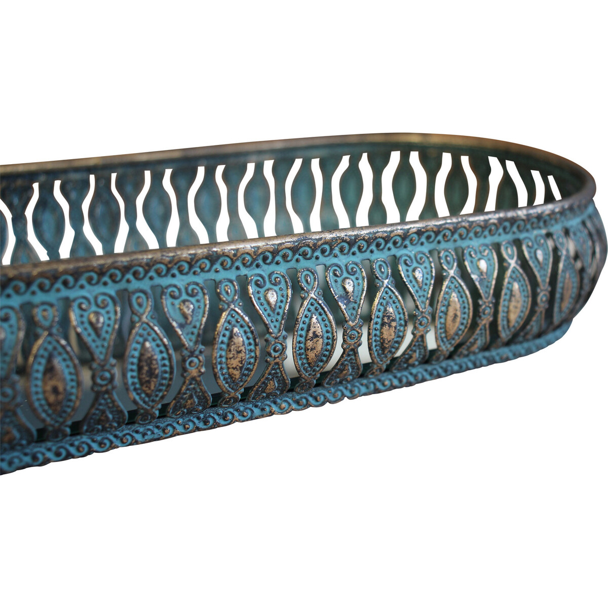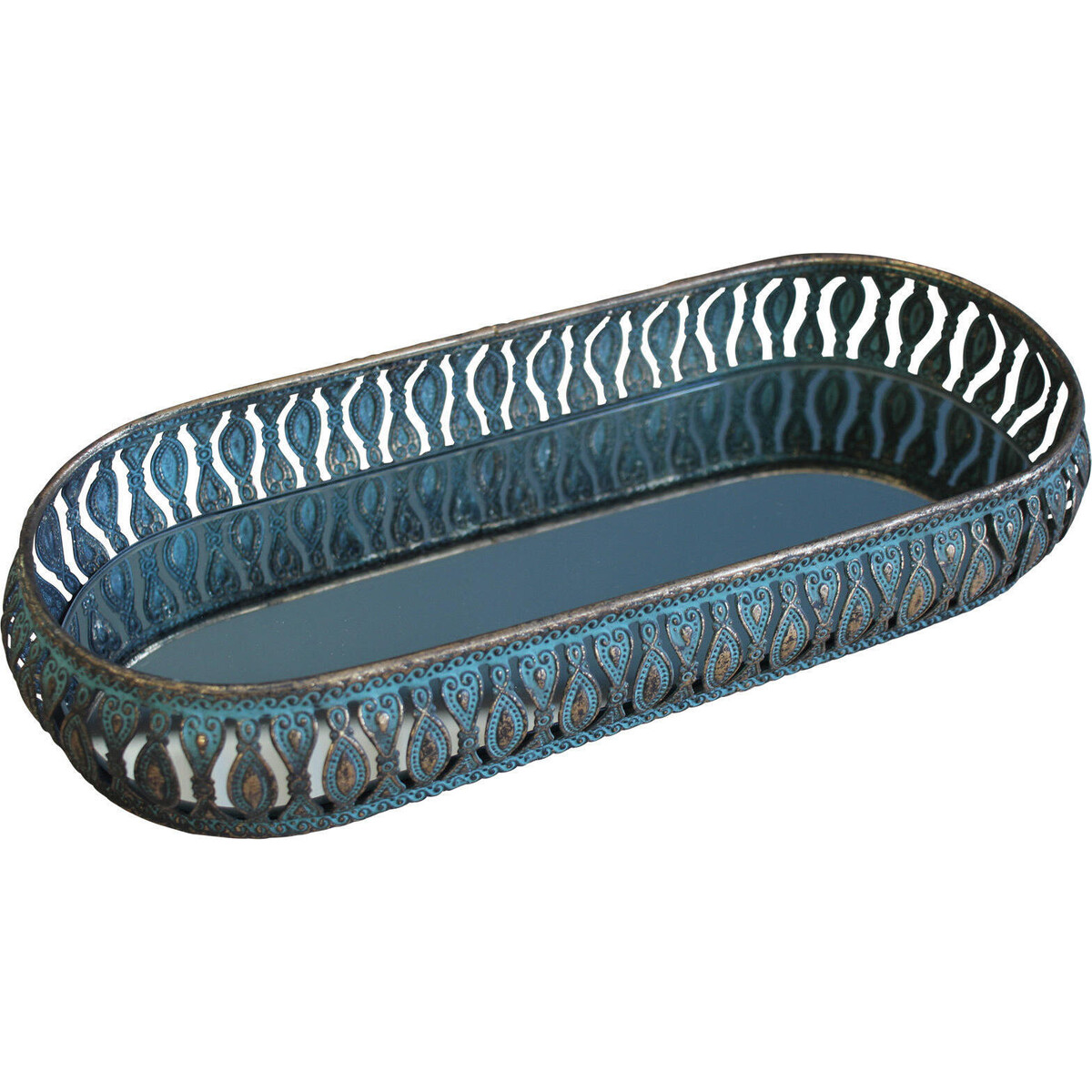 This 30cm rectangle Cyrus tray is elegant and brings a touch of vintage style to any decor and is a decorative yet versatile piece for your home. Made from metal, it has a metal frame wall with ornate detailing and the rich blue hue and oxidized silver rim and pattern highlights will add some antique taste to any room.