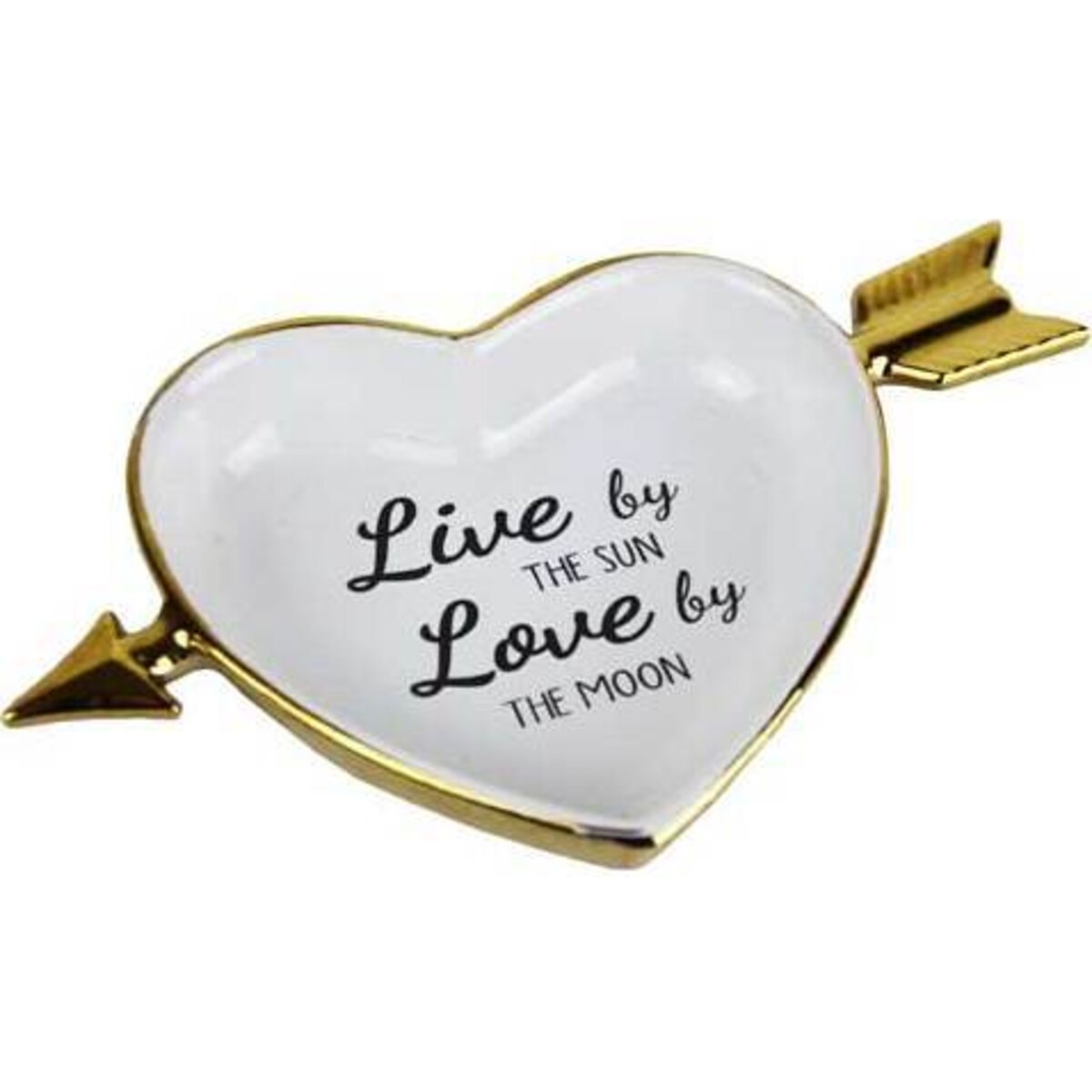 Messages that instil a feeling of love and being loved are great when the look of the serve ware is as great as this white and gold tray. The heart shaped tray has this detailing of an arrow that has been replicated to perfection. The white inner surface hosts the words - Live by the sun and love by the moon, while the underside of the tray has a golden colour giving the tray a look of luxury and lushness. Whether used to serve your guests or simple for display the look is truly display worthy, n both ways the tray will be scintillating in its impact. Bring the beauty not just of a play of colour but also quirky style into your serve ware with this range of ceramic art from Lavida that has always experimented in newer statements for the home each season. The heart shaped bowl is great to place candles on it s that it could catch the gorgeous ceramic work or could be used as a regular serving bowl. Used any way it is not going to miss the eye because of its masterly craftsmanship and finesses of work. The bowl is about 16 cm in with and 10 cm in length with a depth of about 3 cm.