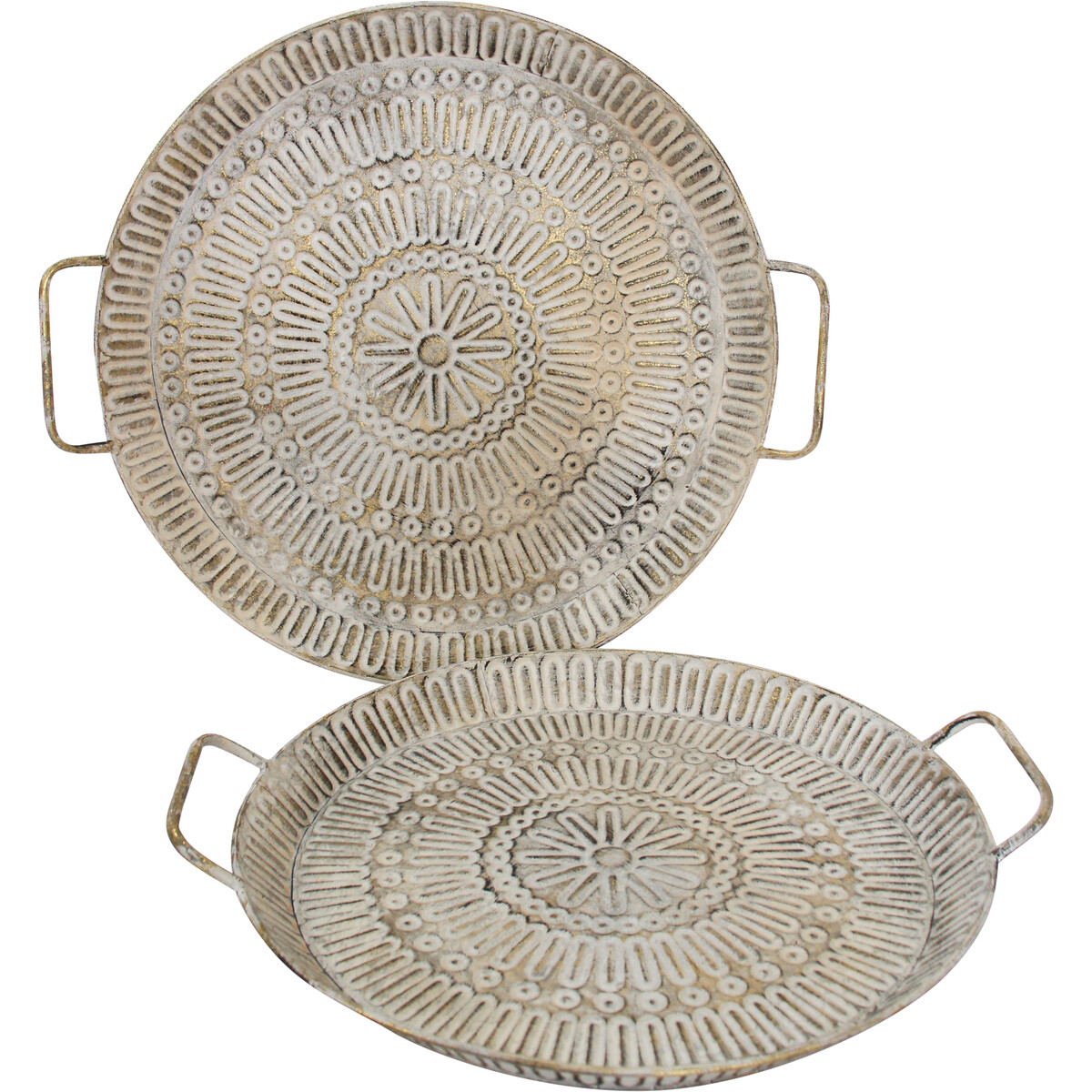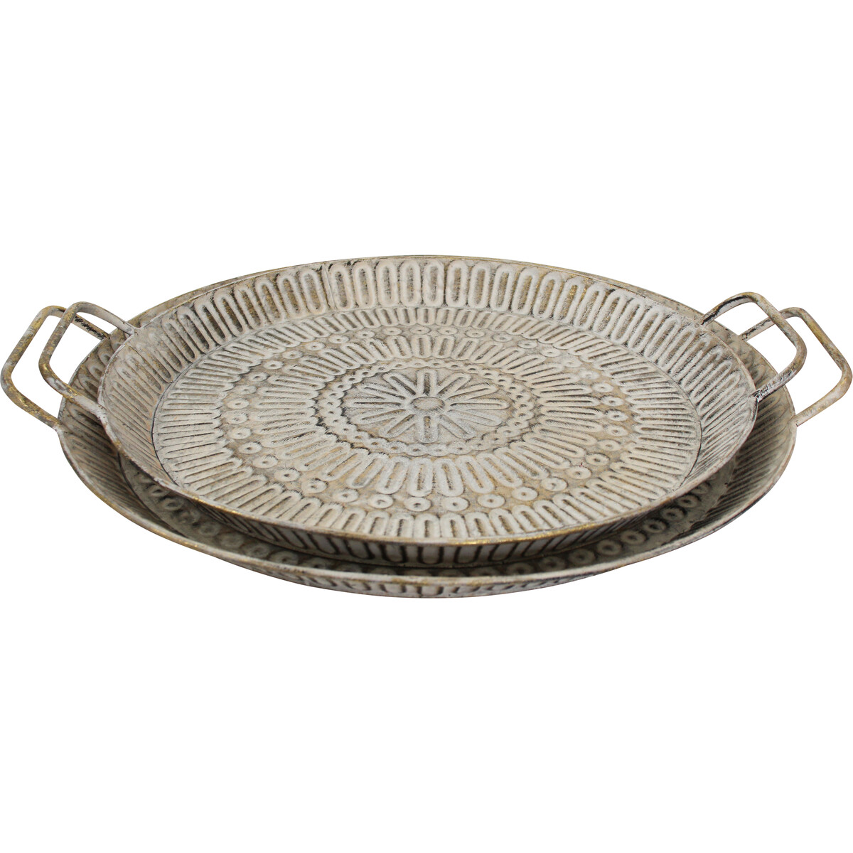 Crafted in a spherical shape, each of these trays is equally ornamented with beautiful patterns which run across the length and breadth of these trays in a spherical form as well. Intricately patterned in a Moroccan motif, it is not only practically functional as a tray, but also aesthetically charged and valuable as an ornament which will add to the overall decorative outlook of kitchens and dining rooms. The large sized variant is made in a dimension which measures 49 centimetres in length, 44 centimetres in width and 6 centimetres tall. The small sized tray however, measures 45 centimetres in length, 39 centimetres in width and 6 centimetres tall.