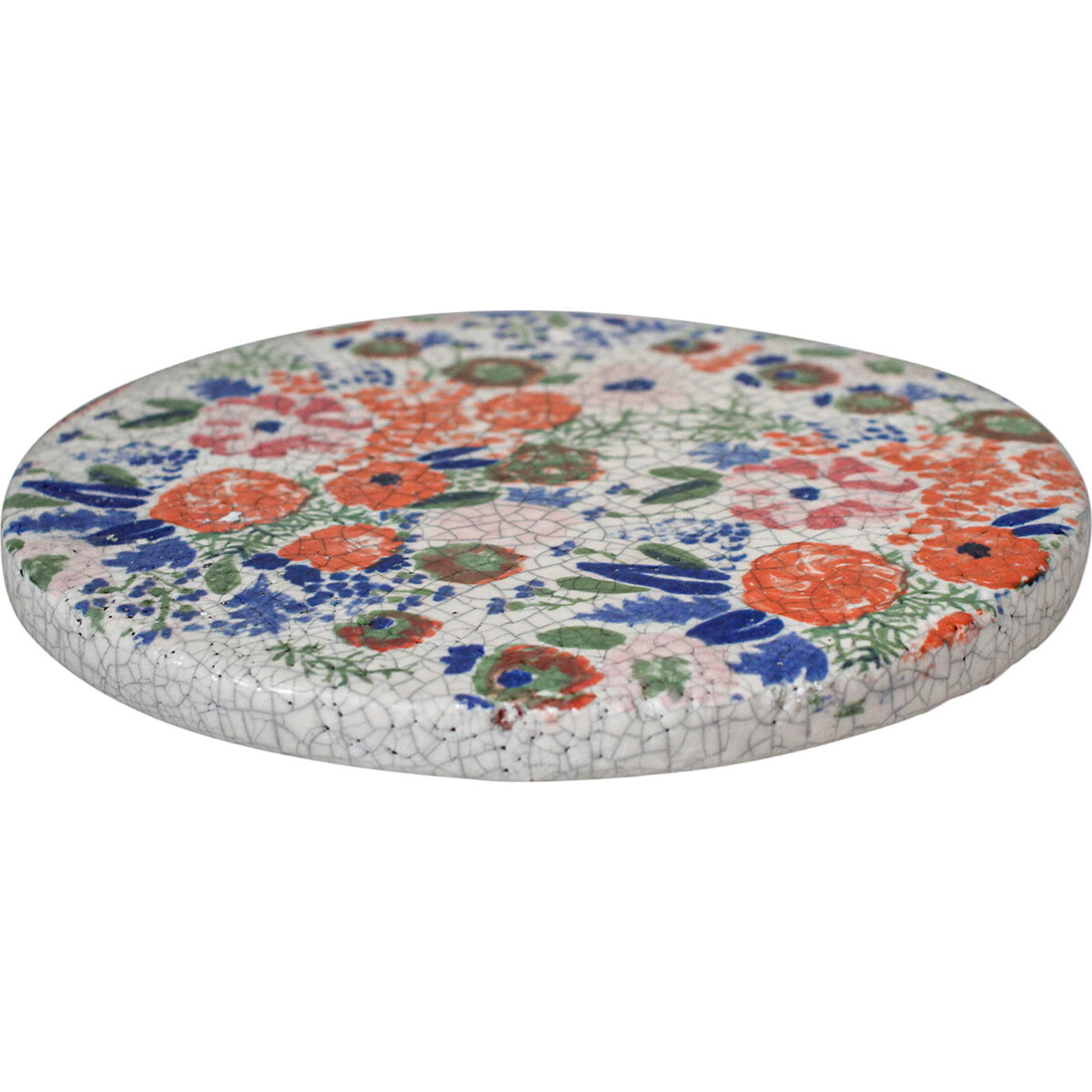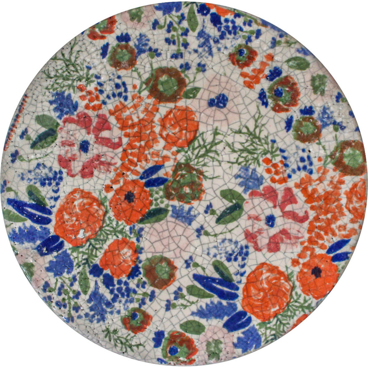 This tray can easily be used in the most versatile of ways-be it to be used as displayable platter on which you could place other articles you would like to draw attention to-or simply use it to serve finger foods or fruits an cheese-there are so many ways in which its beauty can bring such a vibrant feel to your setting. Made from very fine quality terracotta it has a gorgeous crackled surface that ash been adorned with a floral pattern inspired by a rambling country garden look. Delightful colours-the round crackled surface and the rustic simplicity of the design makes this such a great accessory to add to your serve ware. 27 cm in diameter makes it amply large to hold glasses and bowls and platters. Use it also for serving fruits or cheese and anything that needs a touch of drama while serving. Can be simply wiped clean with a damp cloth to regain its sparkling sheen.