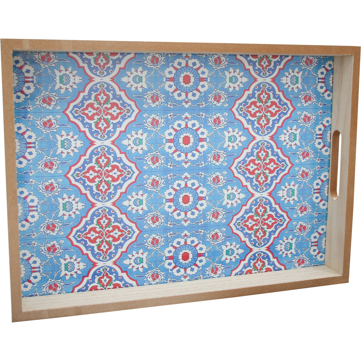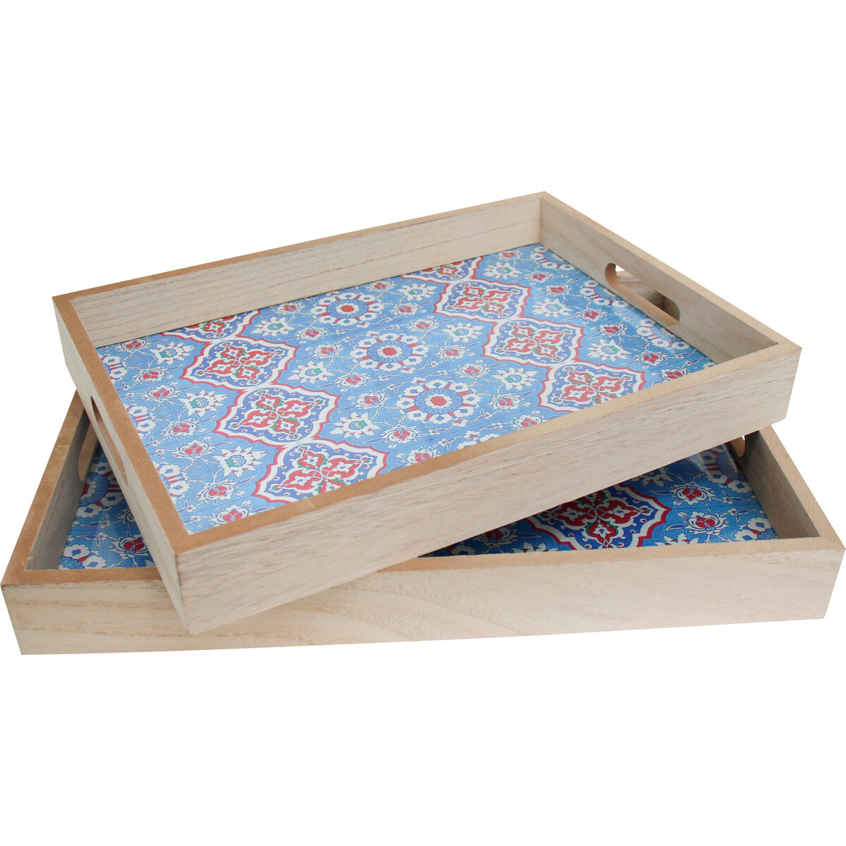 The Tray S/2 Blue Motif is an innovatively crafted tray that stands out distinctly from conventional trays given its artful shapeliness and floral patterns and choice of a beautiful predominantly blue hued palette. Crafted using top quality medium density fibreboard material and with its interior encased in highly translucent glass materials, it is crafted in a rectangular shaped design which is simply lovely. It even comes with an ergonomic cut in handle on each end of the tray so as to make handling and carrying easy. It consists of two sized trays of large and small sizes.