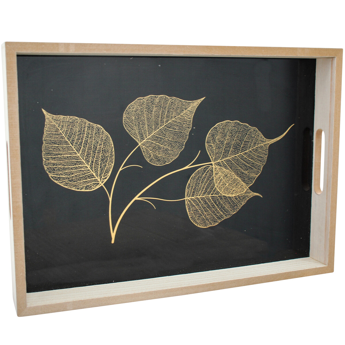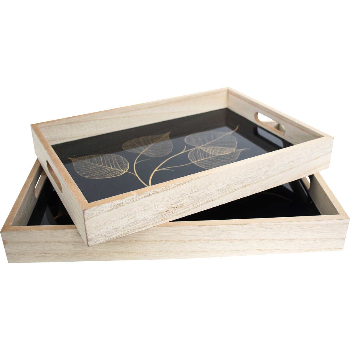 The ornate leaf decorated pattern which appears on the interior surface of both trays sold in this set appears to be simplistic in design. However, it is in the simplicity of this appealing motif that the complex aesthetic appeal lies. Each tray showcases a single floral plant which dovetails into two broad stems and having a total of just four large leaves. The black and gold coloured leaf ornamentation is certainly a standout feature which will attract customers to this two trays making it a consistently selling piece.