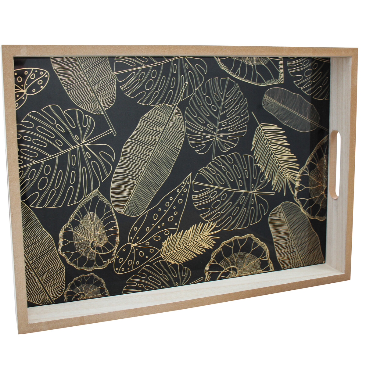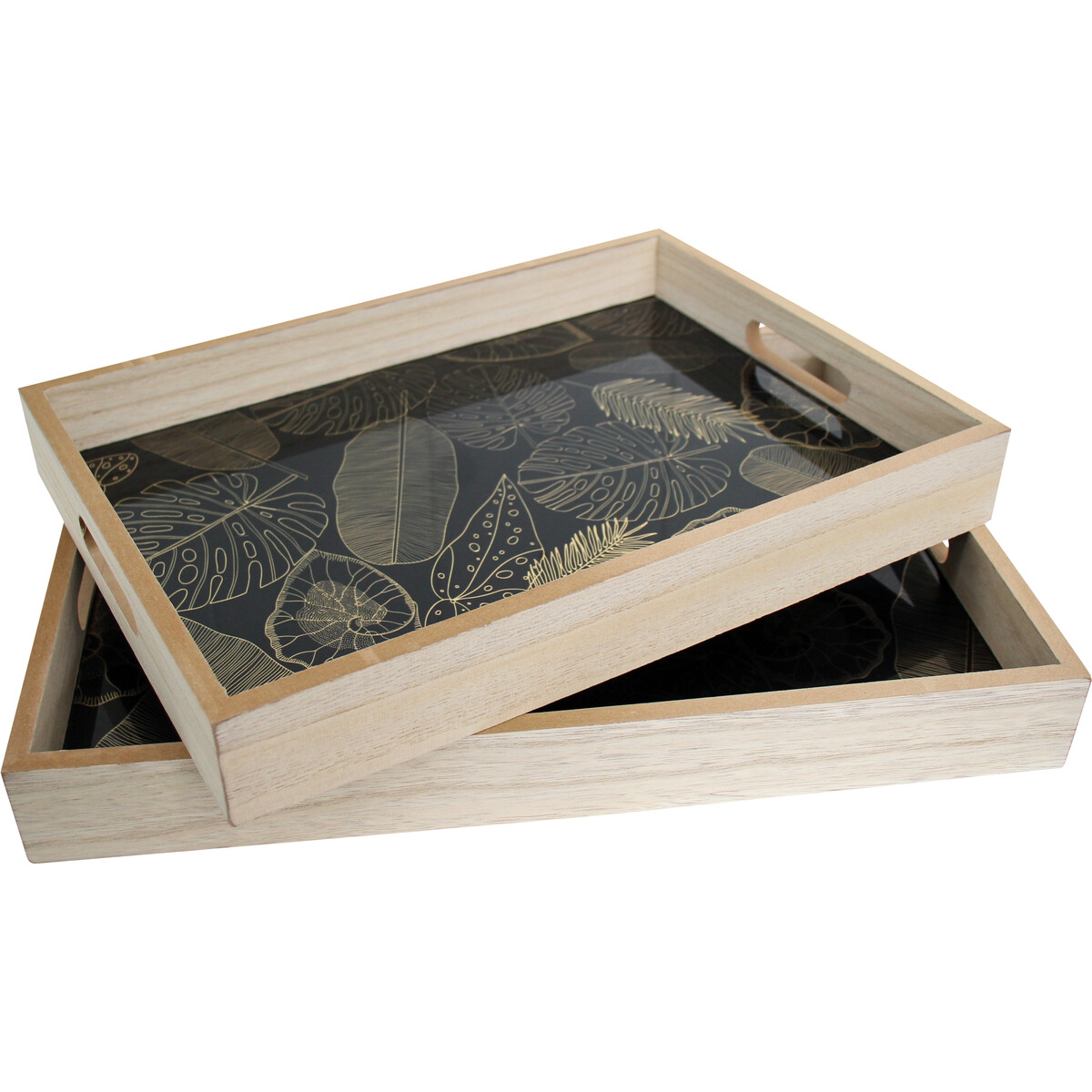 The classic aesthetic appeal possessed by this Tray S/2 Jungle Leaves is not just as a result of its balanced combination of colours or the shapeliness of the tray, but also because of its thematic preoccupation with nature or plants. The interior of each of the two trays in this set is painted in a classic jet black hue which provides the perfect backdrop for the intricately outlined shapes of leaves belonging to different species of plants. The outline which is rendered in gold over a black background gives a stunningly irresistible visual appeal which customers would love!