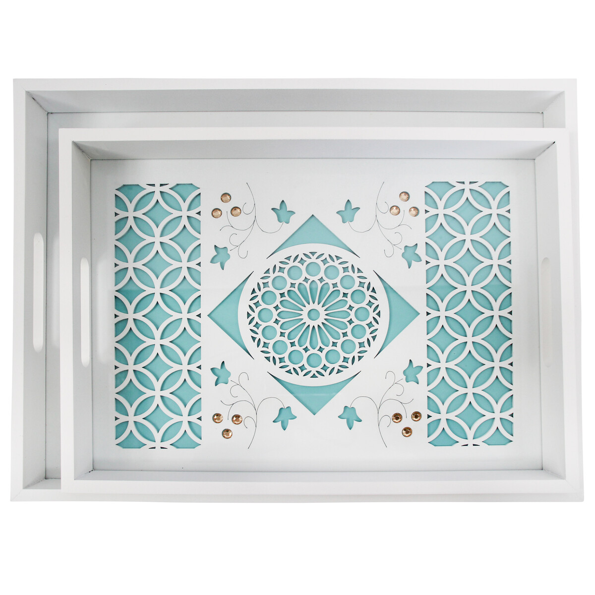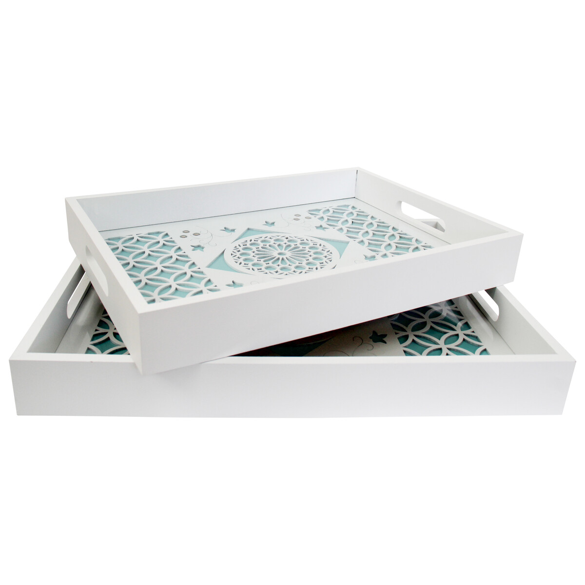 The Tray S/2 Rect Sky is beautifully crafted in a stunningly attractive form through the ingenious use of top quality medium density fibreboard, crystal clear glass, pure quality resin, and durable paper materials. The two trays contained in this set are crafted with the same design showcasing an ornately patterned interior, ergonomic handles which makes carrying the tray easy. The thoughtful combination of pristine white and cool emerald green creates the perfect aesthetic spectacle. This ornamental tray would therefore blend in seamlessly into every decorative setting.