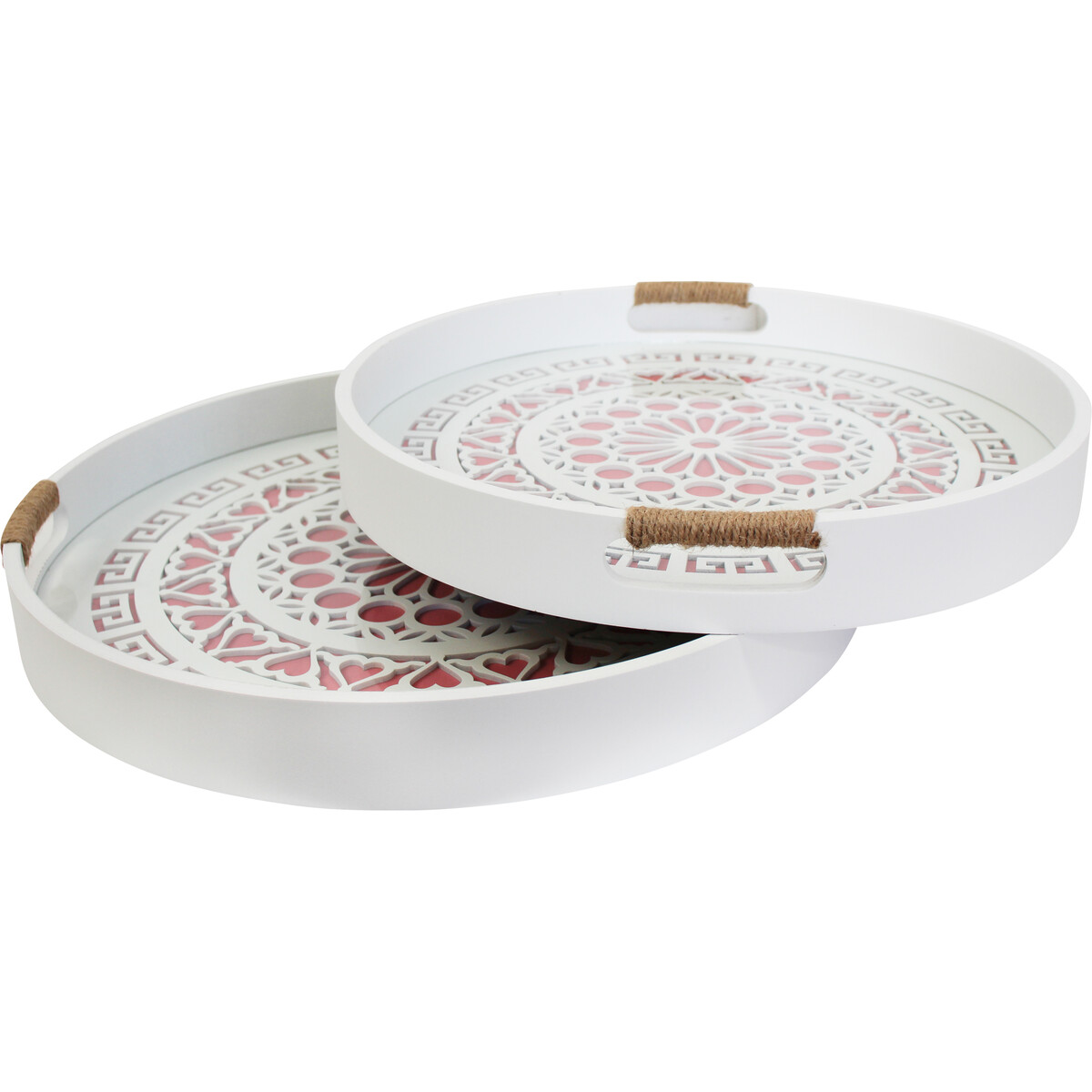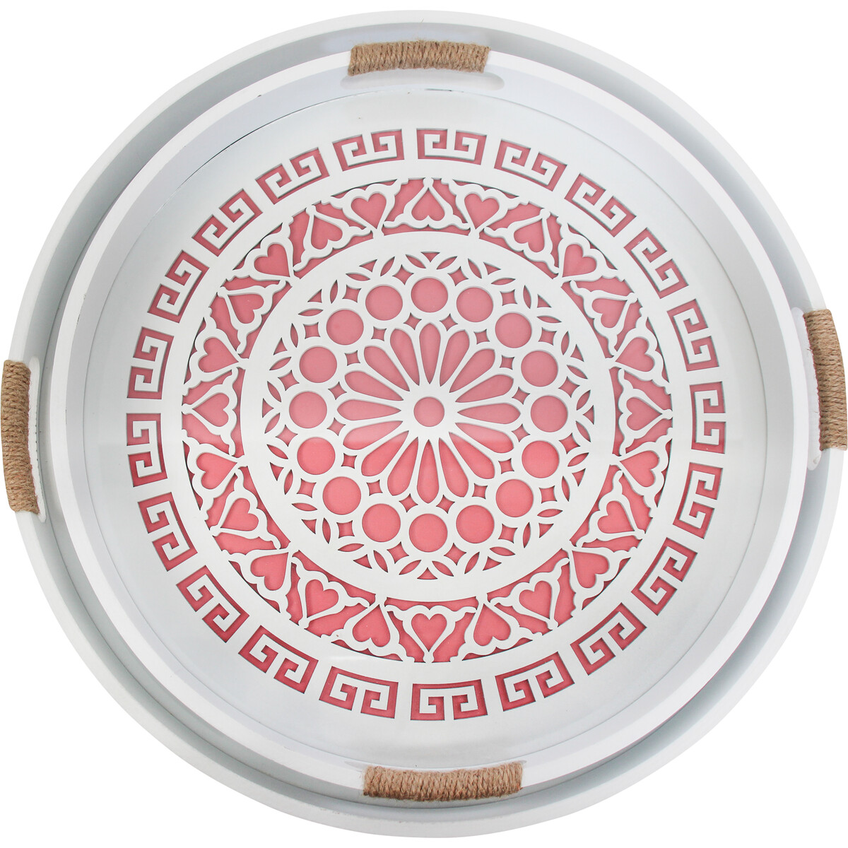 The large sized Tray S/2 Round Blush is made in a round dimension which measures 40 centimetres in width, 40 centimetres in length and 4.5 centimetres in height. The small sized round tray on the other hand, is made in a dimension which measures 36 centimetres in length, 36 centimetres in width and an equal 4.5 centimetres in height. At the centre of both trays is an ornately patterned design which is rendered in a beautiful pink and white palette. The tray is also given a rustic decorative finish through the use of twine ropes tied to the trays' handles.