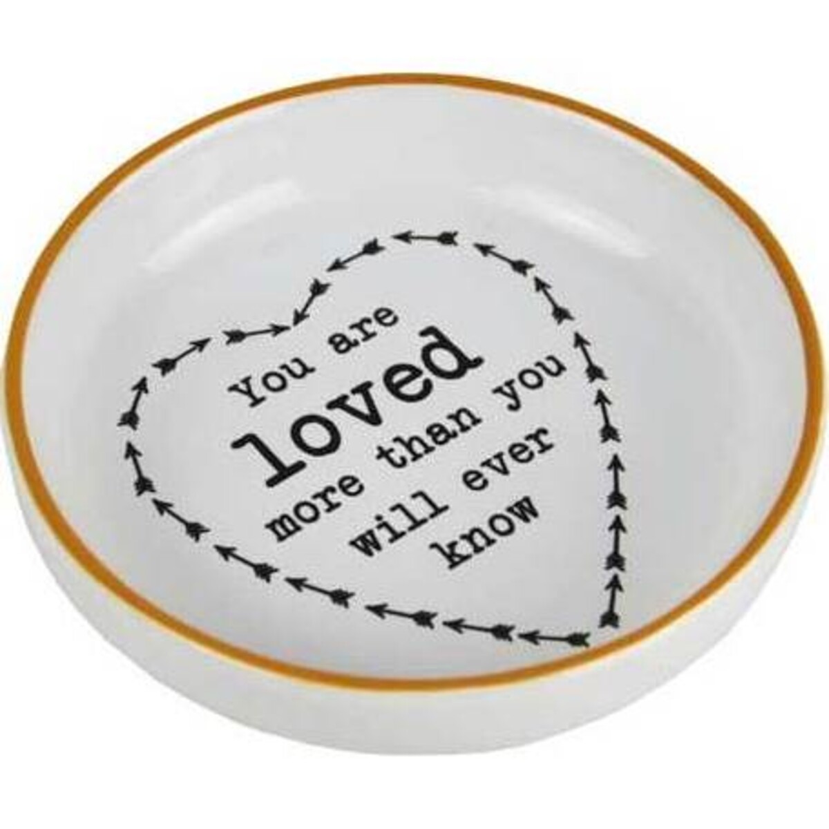 This ceramic tray in white packs in quite punch with its simplicity and style that is quiet and understated, a real farm and country feel that is low on too many details and too much fuss. Modern homes will do well to own such pieces that will make sturdy serving dishes and also be loved if they are placed as standalone piece. It's the message that makes so much difference that conveys unadulterated unconditional love - the kind that will warm your hearts with its warmth and honesty. The inner depth so the tray has this arrow lined heart made is a border and within that are words that seem all the more special. The ceramic tray has around shape and the diameter is about 10 cm making it moderately a small little piece that can be used in sets. Plants that have to be watered and need to be kept indoors can be placed on this tray or one could use it to place candles when occasions are special.