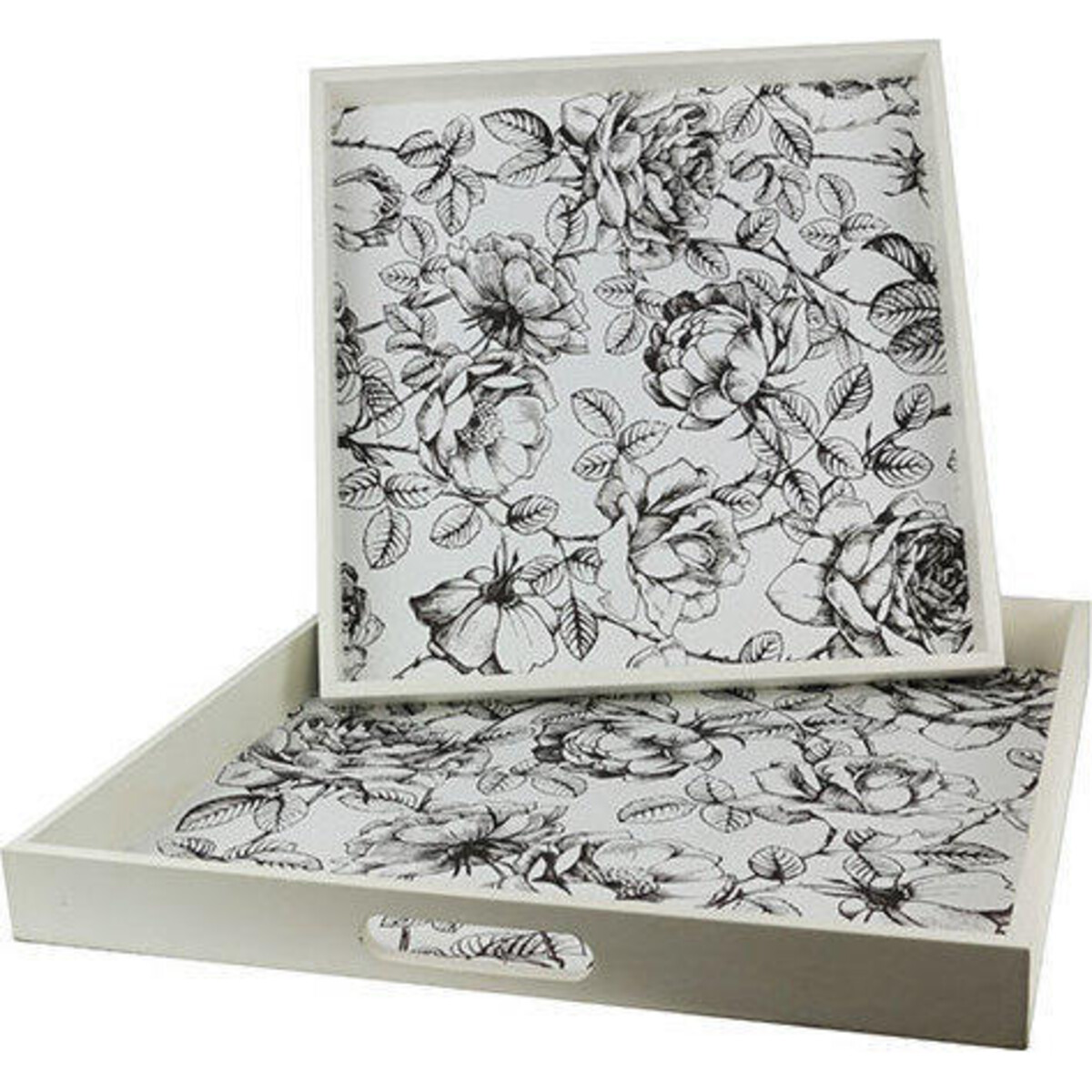 Serving food and beverages couldn't have been made more artistically pretty. This set of two trays fabricated with an eye of great aesthetics makes your coffee or tea time seem all the more worth cherishing when you bring out this set of wood made trays. It is perfectly balanced with a skid proof hardy paper base in a white and black floral print. The floral aspect lends the wooden frame work the touch of artistry and the matt finish of the base makes the carrying f glasses and cups or other glass objects atop them so much more fall free. The proportions of the tray too meets the need for everyday usage with the smaller one at 35 cm dimension and the larger one at 40 cm . The trays have a solid base with a printed paper cover that is tough and resilient against usage. Water proof and fade free. Whether your style is modern or traditional asset of trays that can be so rough and ready to use and yet features such a pretty look is surely a great find. The lifted rim makes for white painted wooden structure seem all the more well defined.