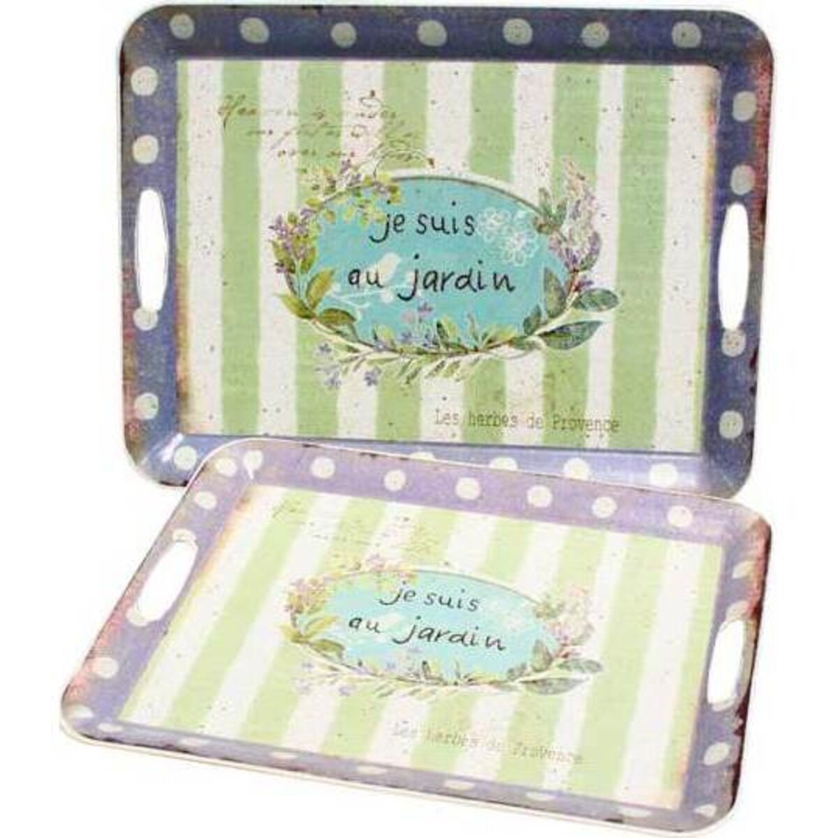 Introducing the Jardin Stripe Trays from Lavida. This set of 2 has the same design of green and white stripes on the bottom with a purple and white polka dot border on the edges and "Je suis au jardin" written in black lettering in a floral bordered circle at the center. Whether you're using these trays to serve food to guests or to put under a vase filled with a bouquet of flowers, they're going to be a stunning addition to your home.