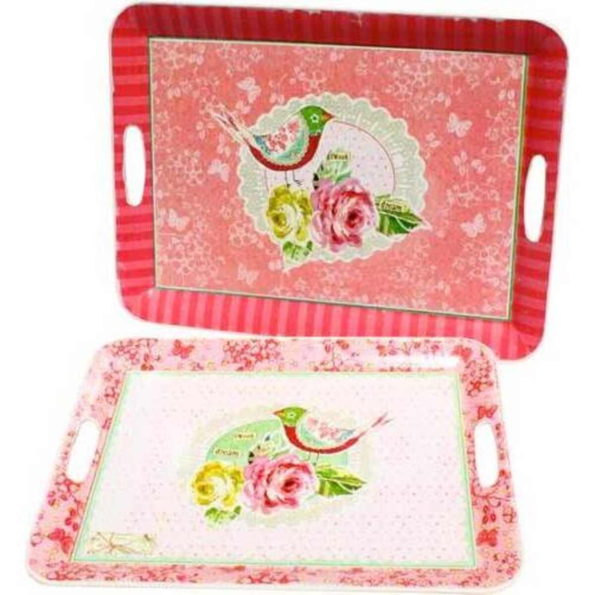 Introducing the Modello Bird Trays from Lavida. You'll receive two different trays with this set, one that features a bird and rose design at the center of a butterfly and floral background with a pink and red striped border while the second features a bird and rose design at the center with a polka dot background and a pink and red floral border. Cut out handles on either side make these trays easy to manage. Whether you choose to use them for food or just to put under decorative accents, you're going to love having them in your home.