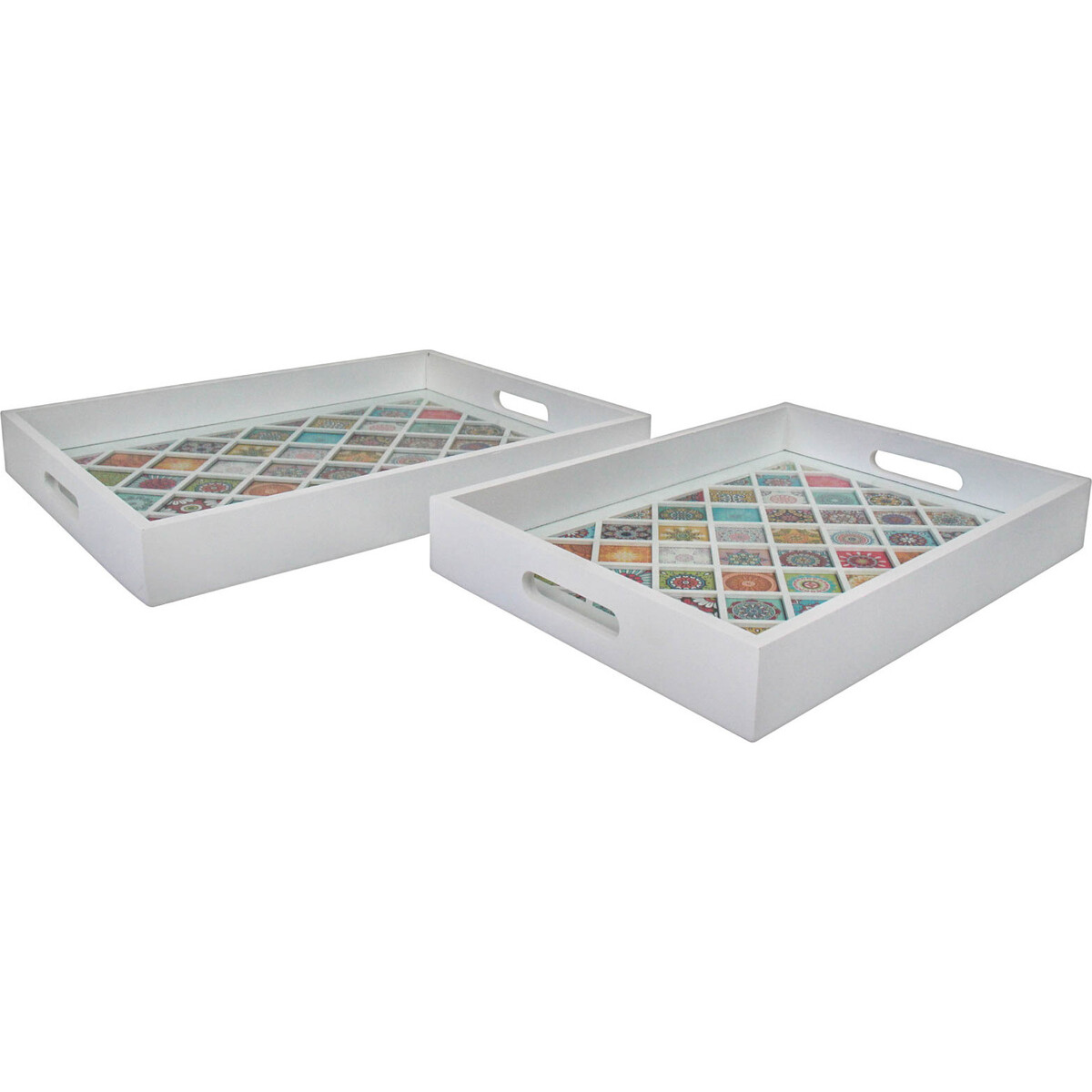Whether you're serving up a spread of delectable appetisers and sweet cocktails at your next family gathering or simply staging a display of potted succulents and flickering tea lights, this understated tray is sure to tie your ensemble together in effortless style. Made with the more dense type of fiberwood giving the piece the right amount of sturdiness. Featuring a clean-lined design with two cutout handles, this tray makes a simply utilitarian statement in your environment. The colours of the floral prints on the trays give the food a more lavish and delicious look! They also come in two sizes: Large and Small. Add it to a glass-top table in the living room to create a bold display in your understated environment, or set it on the kitchen counter with your French press and a few mugs to curate a casual beverage center.