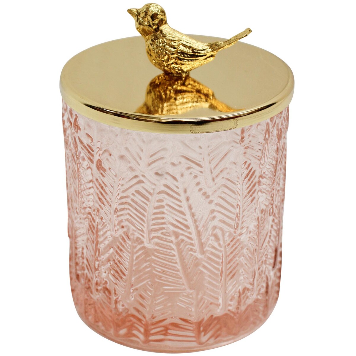 We have this gorgeous Trinket Bird Oasis - it’s genuinely a standout piece. Designed from glass with a beautiful gold-finished lid, this one’s got that lovely soft pink hue with delicate, textured leaf patterns all over. There’s a small bird perched on top that makes it so much more than just another trinket jar. It’s actually a really versatile little number - customers could use it to hold jewellery, coins, or anything they fancy, really.
