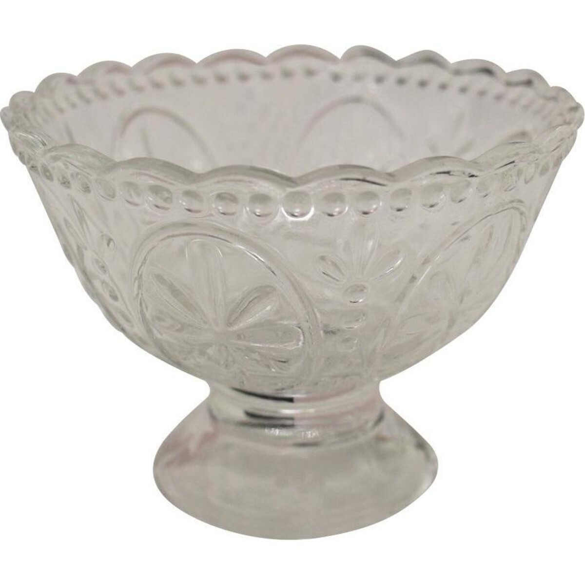 The barely 9.5 cm high bowl has an elegant appearance that comes from its tiny stand on which its circular body aligns so well. The fleur design is evident on its gracefully curved body. The trim like edges reminds one of Victorian lace - as if a throw - back of a vintage design, the glass has been fashioned to remain sturdy yet have all the delicate features of fine glass cutwork. The bowl could be used in multifarious ways - serve nuts, keep candy or chocolates on the console or the coffee table. Or simply use it as a set of bowls to serve all kinds of finger foods. There is always place for something as beautiful as this to make your serving all the more interestingly vintage and charming.