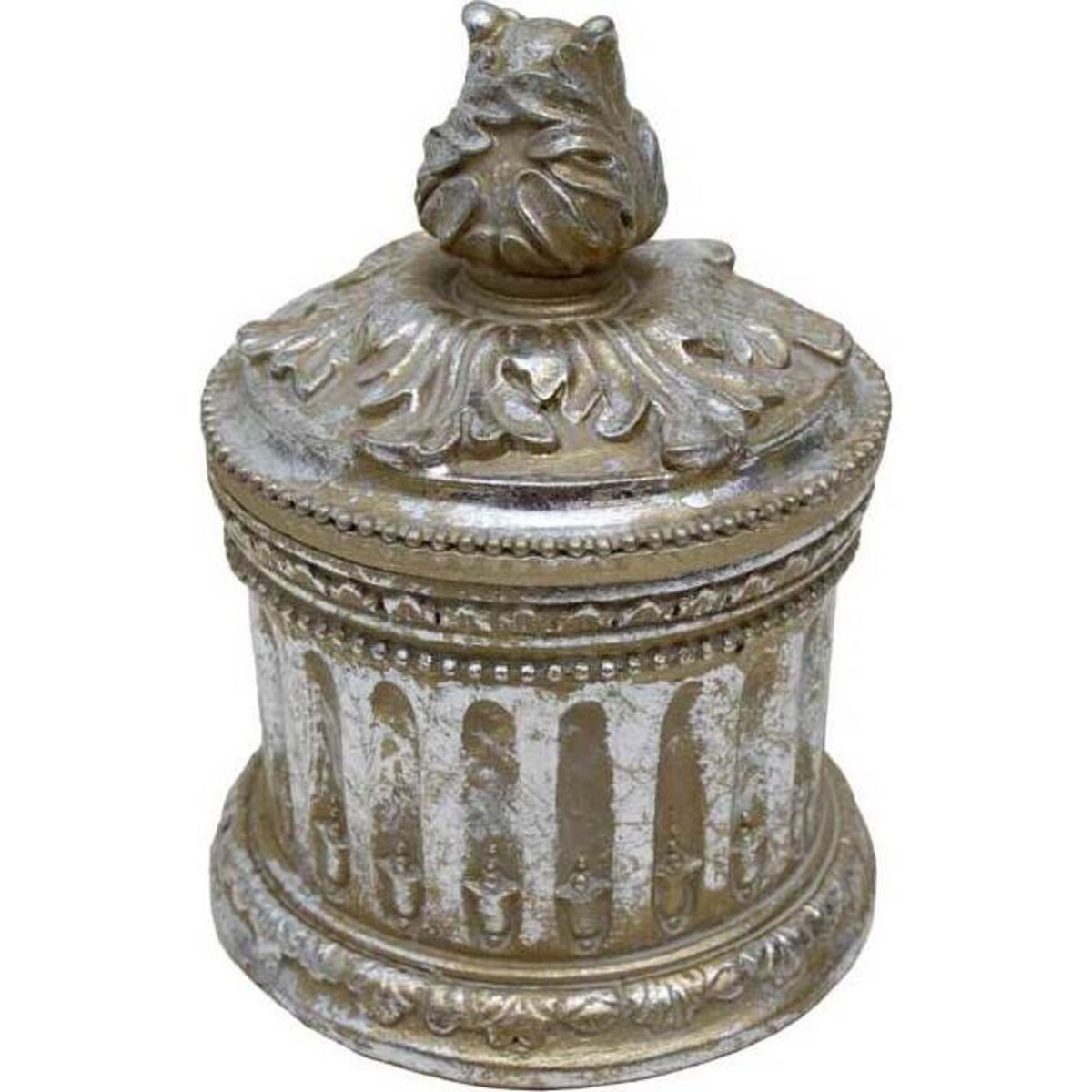 It will make a wonderful addition to the collections of those who like small boxes, and you'll find your customers purchasing them to keep and to give away as gifts. Acanthus leaves were one of the most popular motifs of Old France and continue today in period style furniture and home decor. • A cluster of acanthus leaves serves as a lid handle. It sits on a ring of acanthus leaves that are raised in bas relief, giving the box a hand carved appearance. • A scalloped border and bead trim surround the outer edge of the lid. • The box's "cornice" continues the bead theme under a scalloped border, and the half-round mold base is ornamented with acanthus leaves all around. • Thumb print fluting finishes the design of the box and silver paint is distressed for an aged look.