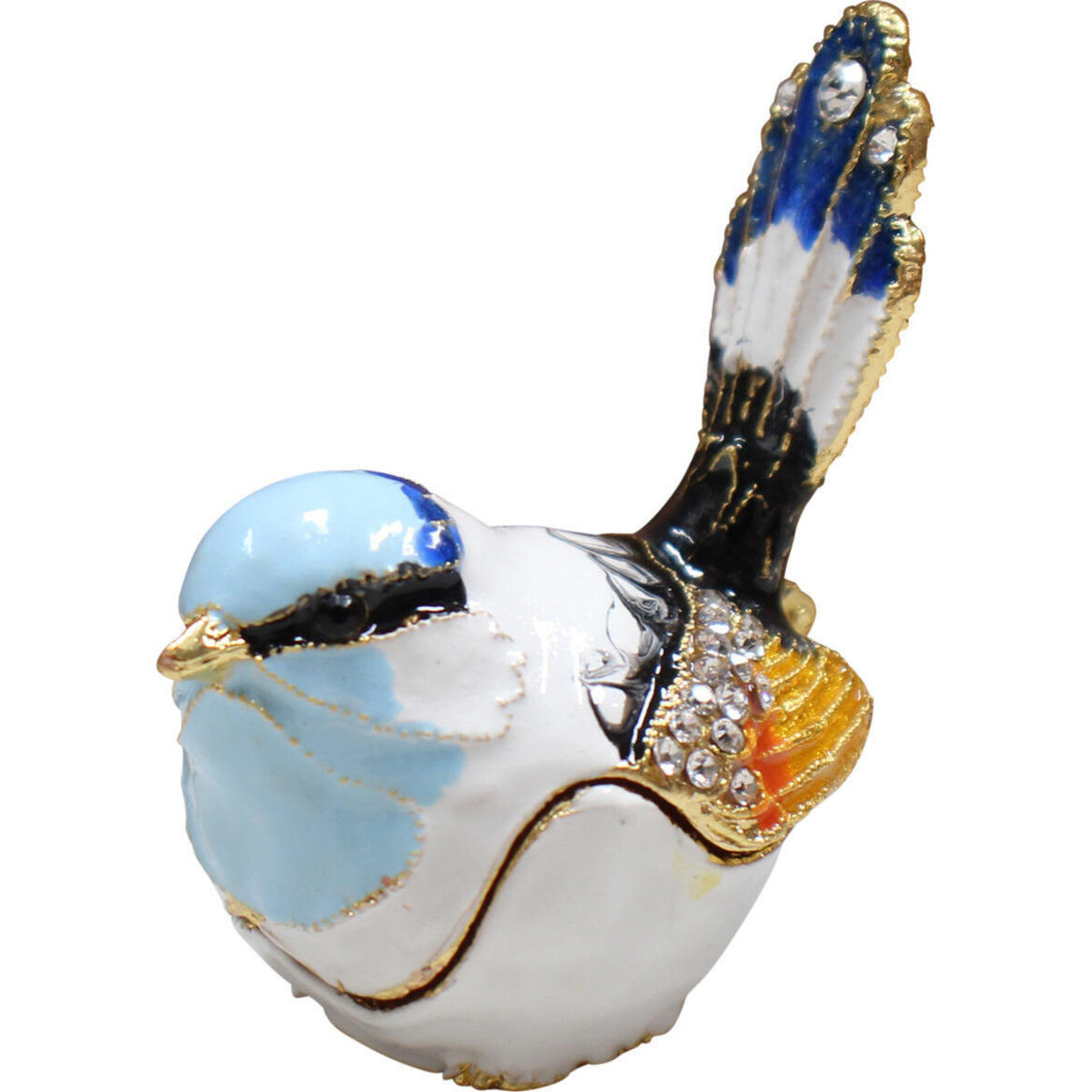 Crafted with care, the wings on the tiny bird is encrusted with little stones that dazzle you with the brilliance. The body has been beautifully enamelled. The colours bright and tropical, like the tiny bird that has bene pretty much created from a live inspiration. The size of the case makes it a likely candidate for all those who like to keep rings, earrings and such tiny trinkets safe and within reach. The upper portion of the lid comes off easily and fits back on to the top with ease. The height of the tiny bird is all of 6 cm and its length from the end of its tail to the back is 5 cm , its pretty soft blue colour-the shape of its beak and its impressive real life look, amazes you with the detailing. A wonderful means to keep your trinket safe while helping you make your vanity space all the more attractive.