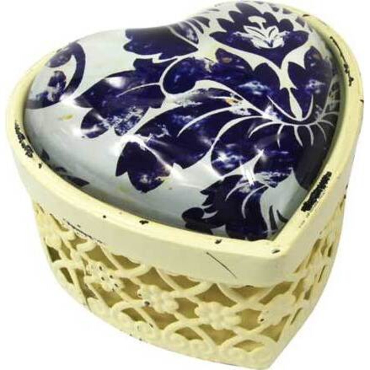 • The timeless heart shape is carried through from the lid to the base. • The lid is a ceramic pillow heart with a soft white background under a Delft blue design of stylized acanthus leaves and antemic or naturalistic shapes. • The "vintage" looking base is created using a mixed metal composition that's been expertly painted in a creamy "yellowed" white, and then distressed to give it the feeling of age and wear. • An open filigree basket weave pattern under a solid rim is embellished with delicate flowers, and keepsakes can be viewed through the "trellis". • Customers who collect trinket boxes or who like to give them as gifts will cherish this sweet little box.