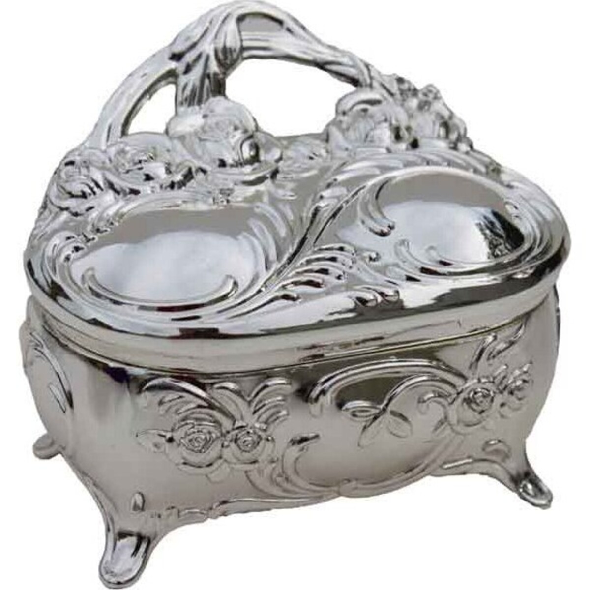 The Trinket Box - Leaf Handle is an astonishingly luxurious jewelry box that boasts a beautiful silvery polish. It looks glassy smooth with its brilliance. Though originally a jewelry box, it can also be used as a decoration thanks to its eye-catching look. Adorning its oblong form are beautifully crafted roses that follow an elegant pattern. And in one corner of the top cover where a bouquet of roses gather, a sculpted pattern of leaves protrude out of the box to form a 'handle'. This makes the box mimic the shape of a jewelry pouch. Perfect for earrings, necklaces, rings, bracelets, and other trinkets, this jewelry box makes one stylish storage box for all your trinkets. It is so exquisite that is also makes a fine box for a family heirloom.
