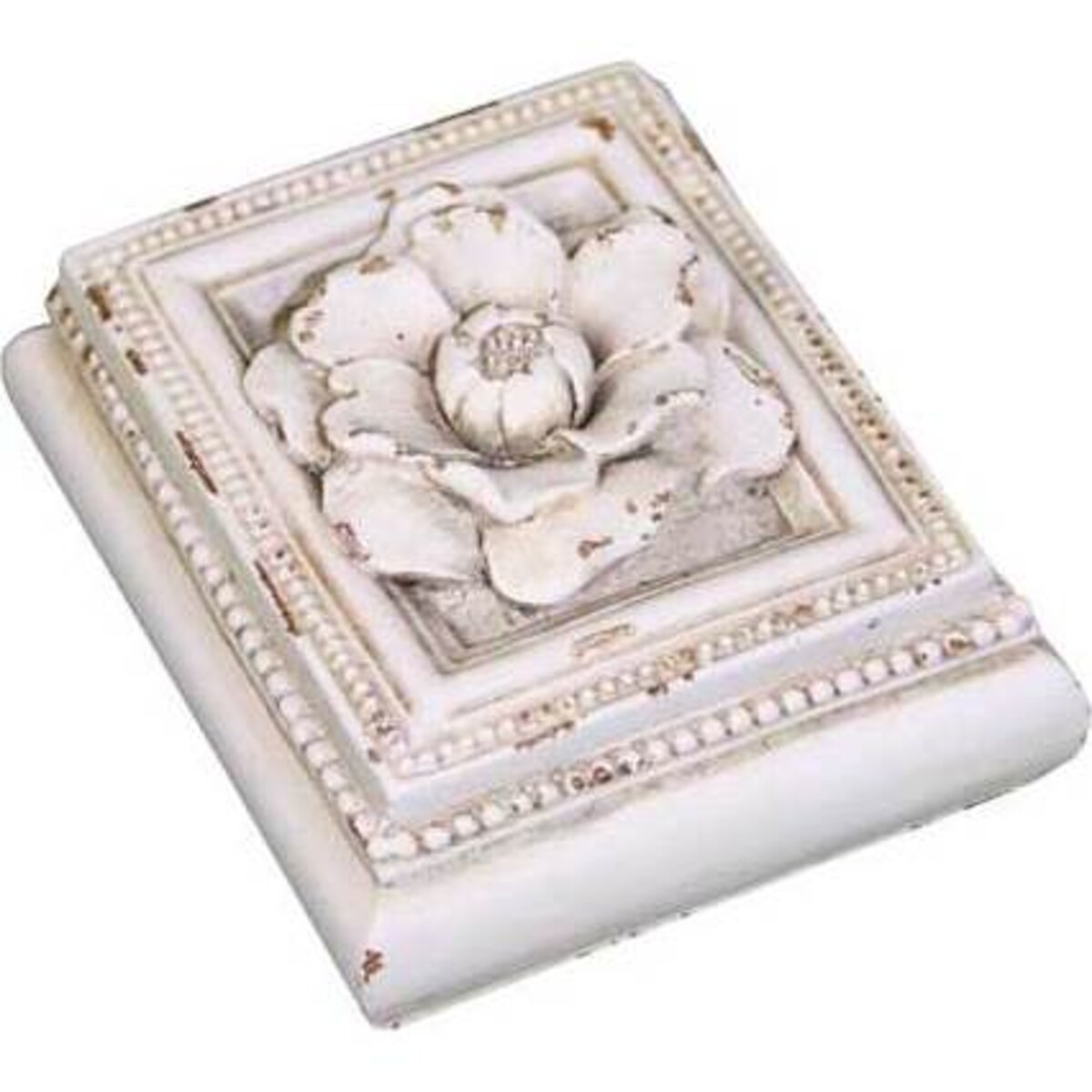 These exquisite resin trinket boxes are off-white in colour and feature beautiful beaded detailing as well as a raised peony on the cover. The surface is aged to give these boxes a vintage feel as if they were picked directly from your grandmother's attic or a local estate sale. Considering their incredible appearance, they would also make a wonderful gift to those you care about. Make sure to let them know that the peony is a symbol for happiness and good fortune!