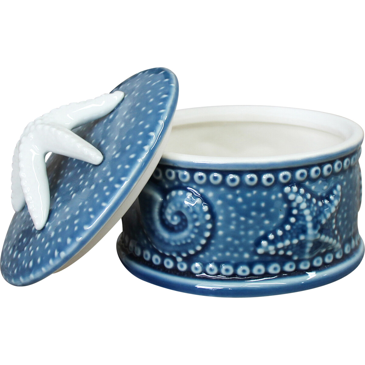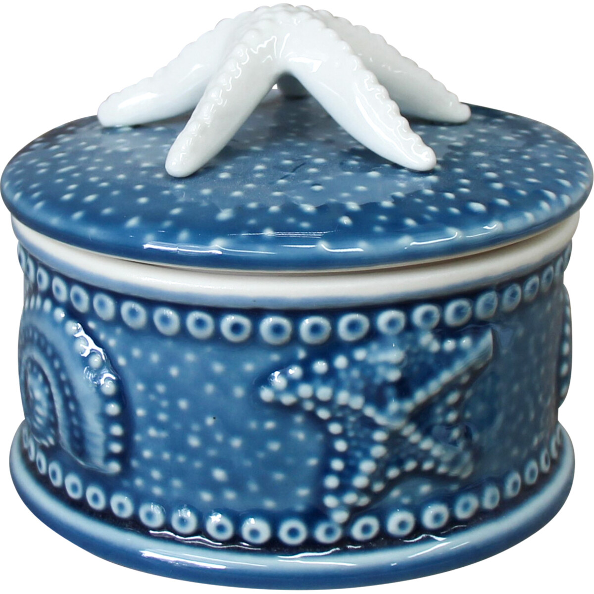 Designed to mingle with your marine themed space- and in a colour sure to impress with its vividness. This trinket box is al of 10.5 cm in diameter and about 8 cm in height which gives it an adequate space within its recesses to hold on to a large number of your tiny wonders. The top comes off easily ad can be lifted away with the white starfish that makes up its crown. The rest of the case is in blue with starfish embellishing the side of the textured blue case. Will add more to the beauty of you dressing space and its size is compact enough to sit well on any table top space. the perfect manager for your trinket-sure to keep them safe and within easy reach.