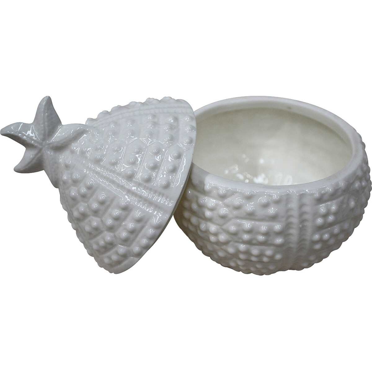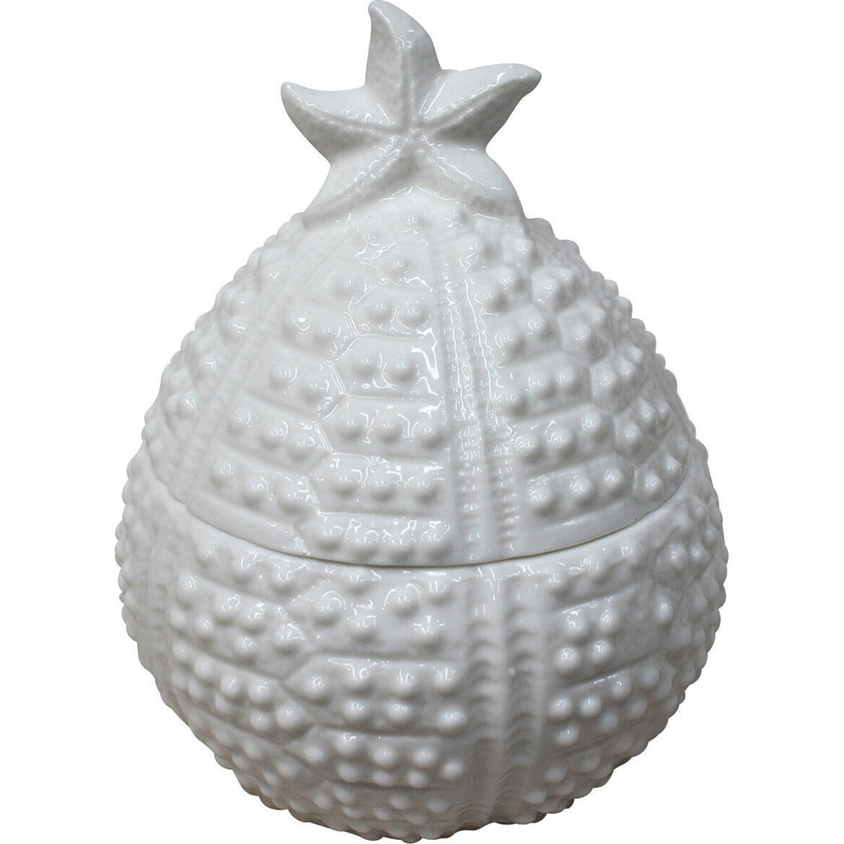 Crafted of ceramic in a lustrous white glaze, this piece measures roughly 10.5cm x 10cm x 13cm in size and can easily hold small jewellery or trinkets. The exterior is beautifully carved and textured and the inside of the box is finished with lovely hand-painted enamel. The detailed little starfish on the top makes a convenient handle topping this egg-shaped trinket holder that will add charm to a seaside decor. Perfect for displaying as beach decor in a bathroom, it can be used to store earrings and rings that are taken off at the end of the day or at night!