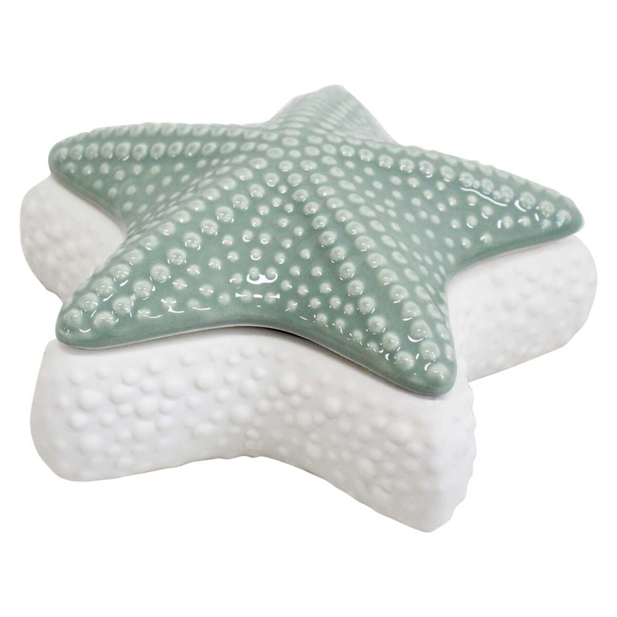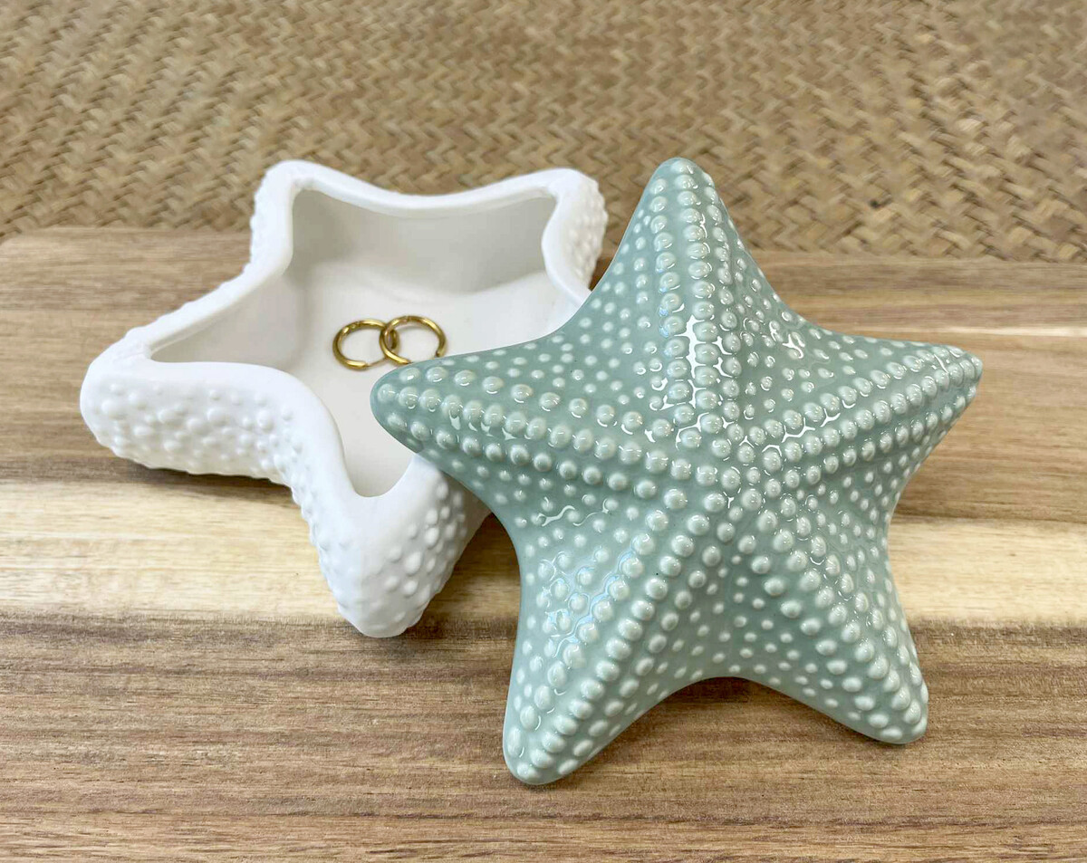 Have you seen many trinket boxes that are shaped like a starfish? This one really stands out from the rest - we love how it has just a little bit of playfulness. The pale, seafoam green top and matte white base really add to the subtle effect, and the raised dotty design means it adds interest to any shelf or table. It’s got a lovely finish, but it’s definitely a handmade piece - there are natural variations and imperfections with the glaze and edges, so customers can expect each starfish to be slightly unique. Oh, and it’s made of ceramic too - not resin or plastic.