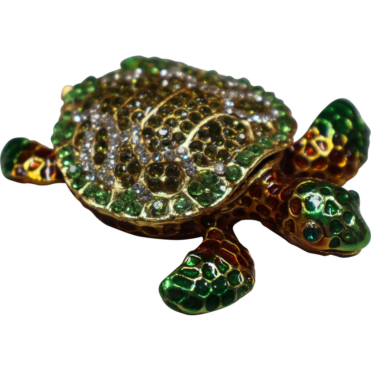 While you may have always loved adding more and more to your trinket collection, it's always bene a worry to find a safe place to keep them. Here is one such option on offer from Lavida created to impress with its beautiful green enamel design and its life like form and its ability to give you a safe little receptacle for some of you most oved trinkets. The handcrafted case is easy to open and close it has a beautiful green coloured exterior studded with stones that glitter and dazzle with their unique pattern. The superb blend of colour and form lends it a fine presence on your vanity space and its look makes it quite an accent for any space of your choice. About 6.5 cm in length and 5.5 cm in its height, it's a lively looking little creature whose lidded top opens up easily to reveal its inner sanctum for all your treasures.