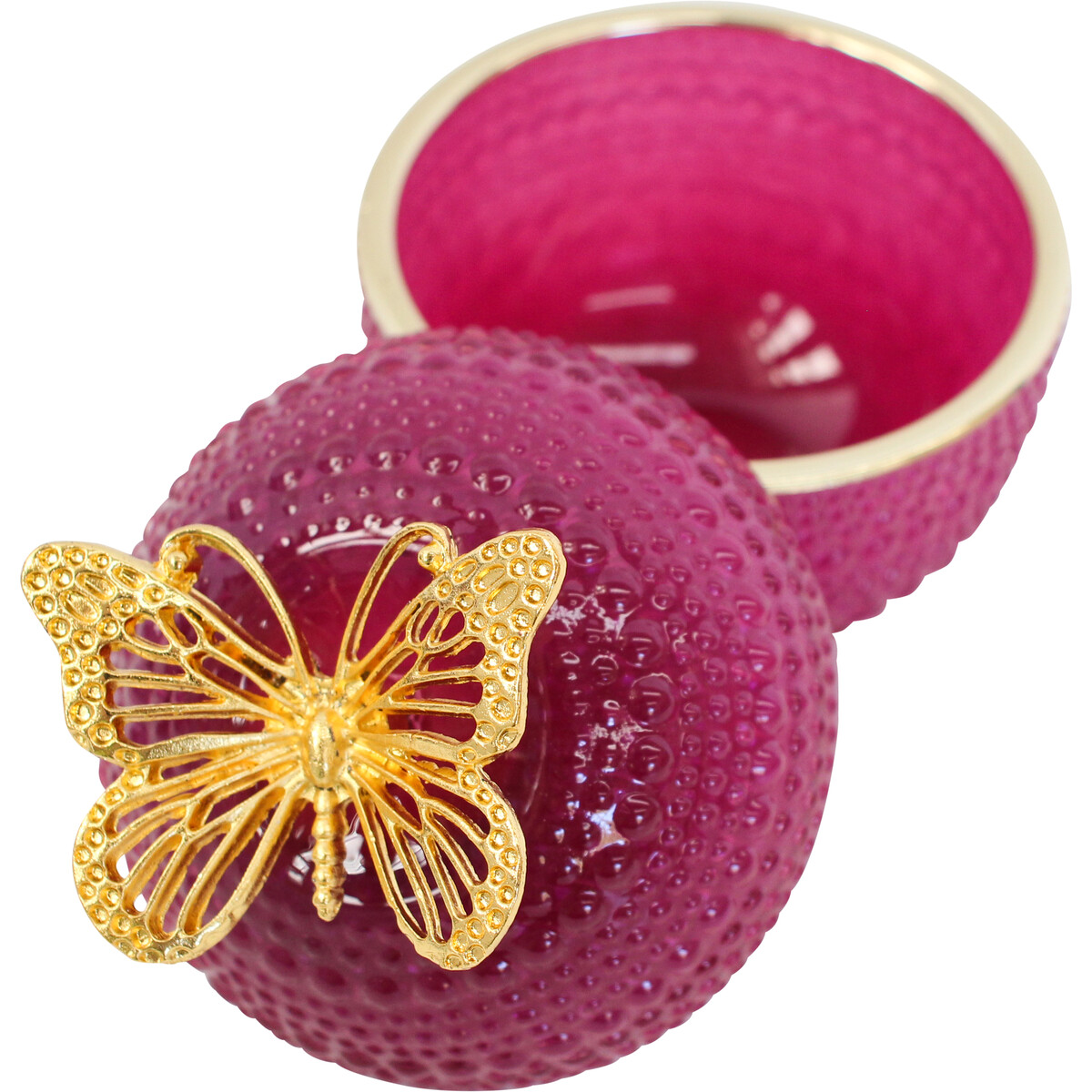 Vibrantly hued in a deep shade of burgundy red, this Trinket Butterfly Candy looks like the bowl of delectable candies with a beautiful butterfly gingerly perched on top of the lid. The interior of this decorative glassware is lustrous and smooth such that it contrasts sharply with the exterior which is textured by several punched patterns. It is made in the form of a bowl which has a lid such that the main bowl has its rim decorated by a thin layer of gold while the top of the lid is ornamented with a gold coloured butterfly figurine.