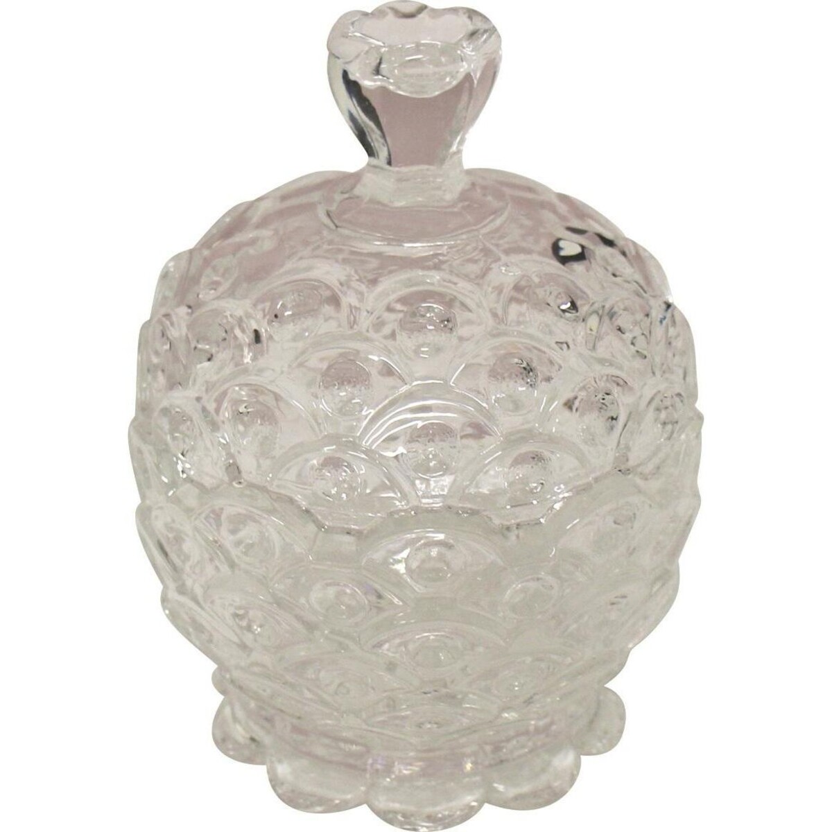Made of glass, this jar is a delight to behold. The scalloped design sitting atop the round shape adds to its many faceted look. When placed under a source of light, it glitters with new life. A solid class body with enough space within to hold a number of your possessions. The base of the glass jar is a very pretty scalloped edge. These are the little details which adds to its beauty. The lid on top has a longish knob that helps open it with ease. You can place a lot of things within - maybe trinkets, some spices, scented petals, or simply use it to beautify the space. After all the things as great looking as this one you don't need an excuse. The piece displays great artistry and is sure to rake in huge a lot of compliments. Place it on your dresser, the dining table or the sideboard and it is sure to be one of the most attractive pieces there. Additional such as this piece has always been one of the best from Lavida.