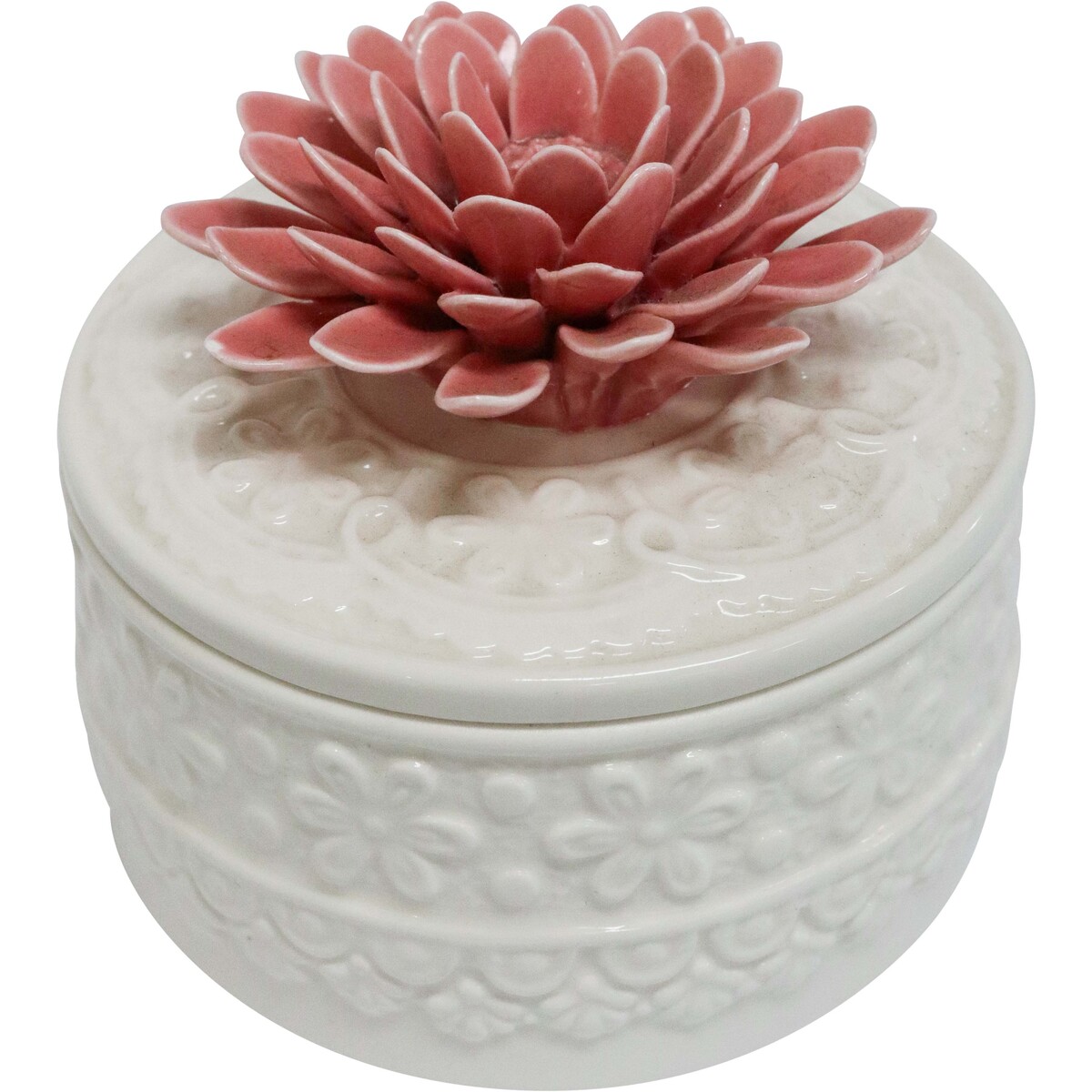 Introducing the Trinket Jar Large Pink Flower – an exquisite masterpiece that seamlessly merges functionality with elegance, destined to captivate the hearts of homeware and giftware enthusiasts. Measuring 10.5x10.5x9.5 cm, this ceramic gem is the epitome of sophisticated charm. Its intricate detailing and stunning pink flower accent make it not just a storage solution but a statement piece, perfect for any home or office decor. Crafted with meticulous attention to detail, this trinket jar offers a refined storage solution, ideal for keepsakes, jewellery, or small treasures. Its delicate design ensures it complements various decor styles, from modern minimalist to vintage chic. The soft, neutral hue of the jar enhances its versatility, easily blending into any setting and elevating the aesthetic appeal of dressers, nightstands, or office desks. Potential consumers will be drawn to its dual functionality and beauty, making it an irresistible addition to any retailer’s inventory. The Trinket Jar Large Pink Flower is more than just a decorative piece; it's a beacon of sophistication and practicality that promises to enchant everyone who lays eyes on it.