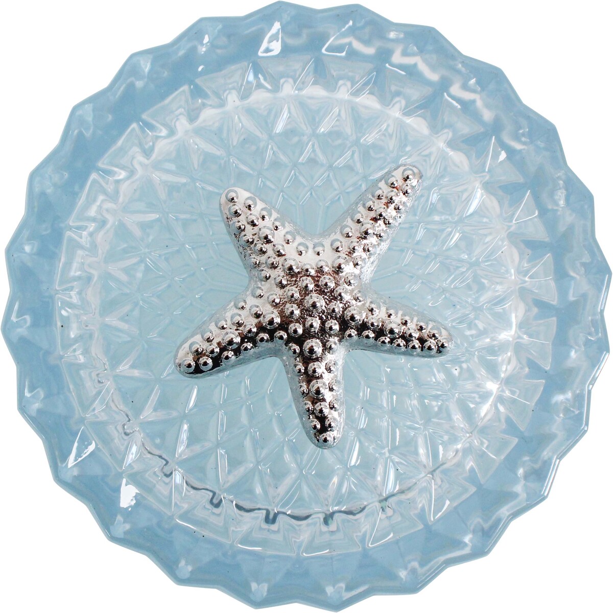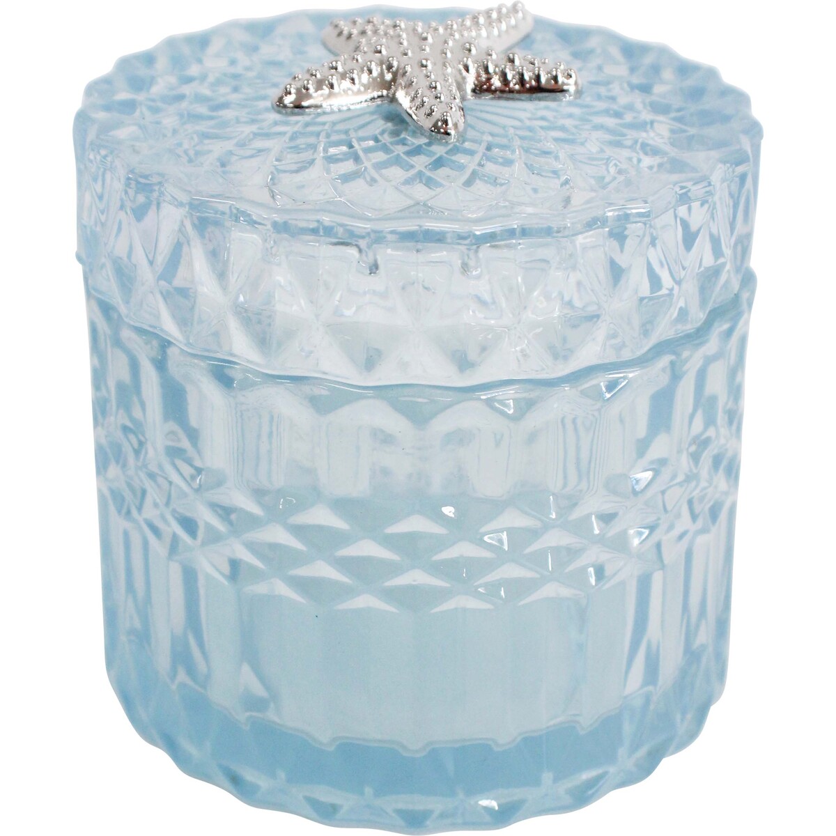 Crafted from resplendent 'Glass', the Trinket Vers Sml Sky boasts a 10cm by 10cm by 10cm dimension, providing ample space for safeguarding your cherished keepsakes or serving as a delightful holder for everyday essentials like keys or jewelry. Subtly textured with a diamond pattern, its pale blue hue evokes the tranquility of a clear sky, creating a serene backdrop for the beautifully detailed, silver starfish resting at its center.