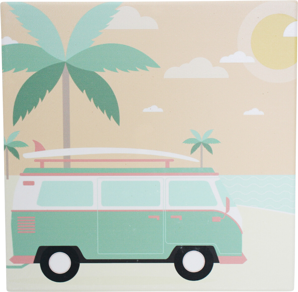 Ornately depicted on the surface of this Trivet Combi Escape 2 is a beach themed image which showcases a Combi, several palm trees, the sea, and beach. The Combi is depicted as being parked close to a palm tree at the beach. The use of this trivet at a family dinner table is certain to arouse some interest and would be a conversation starter. Apart from the decorative enhancement it would bring into every dining setting, it would also offer the table maximum protection given its 0.7 centimetres thickness.