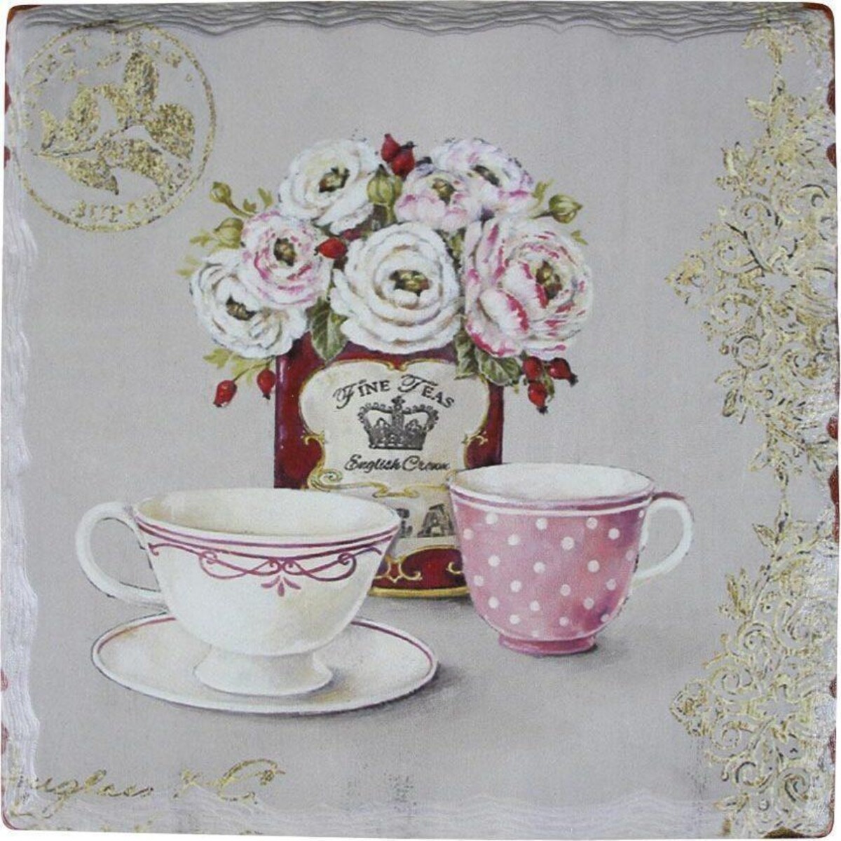 It is square and hosts the most delightful pastel colours that make up its beautiful creamy white and pink coloured face. It comes with the look of a summer high tea or lemonade time when you would be out in the garden sipping on hot honey lemon tea and basking in the calmness around. Such beauty should not be disturbed by the worry of the stains left by the teapot or the ring of water left by the jug of chilled lemonade. After all, surfaces be it wood or glass, do face the threat of this all the time. Simply use this trivet to help land your hot casseroles, pots, pans and the likes, on counters tables and the dining table with utmost ease. The square trivet is about 16 cm in dimension and would look graceful in any space. Features a subtle coloured print showcasing a very English afternoon teatime look. The flowers, the delicate China tea cup and the beautiful subtle grey coloured backdrops makes it a rivetingly pretty accent while not on the job.