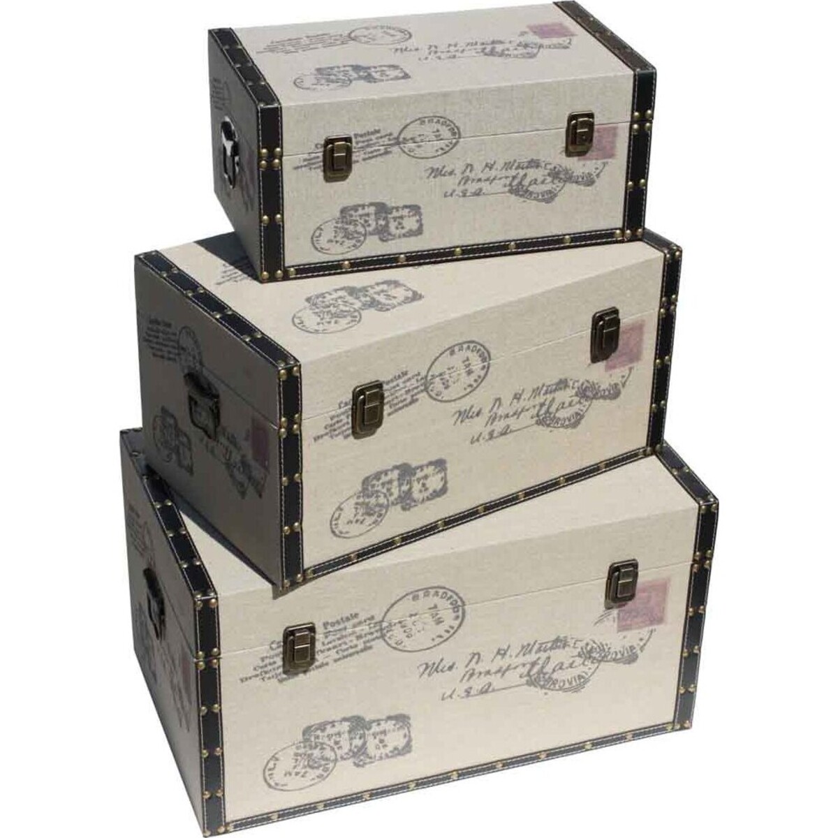 This set of three postage stamped trunks stack together in ascending order of size. The neutral colour scheme and stamp theme conjure up images of foreign travel to far off, exotic places.