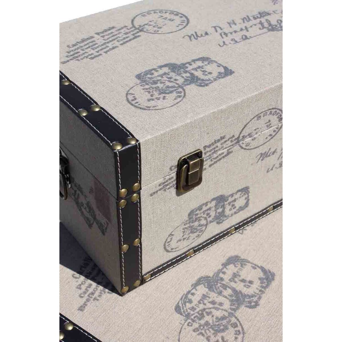 Why buy just one trunk when you could have the entire matching set? Traditionally trunks such as these were used to transport personal belongings on long voyages. Now they make a fun option for storage and decoration that gives off an antique feel of a past era. These trunks are lined with studded leather like strips. They fasten together by means of two metal clasps that fold over themselves. The stamp decorations go together well with the set of two linen footstools of the same name. Use them as an additional means of storage, perhaps for a collection of old letters or other sentimental objects. Try stacking them on top of each other or scattering them around a home or office space.