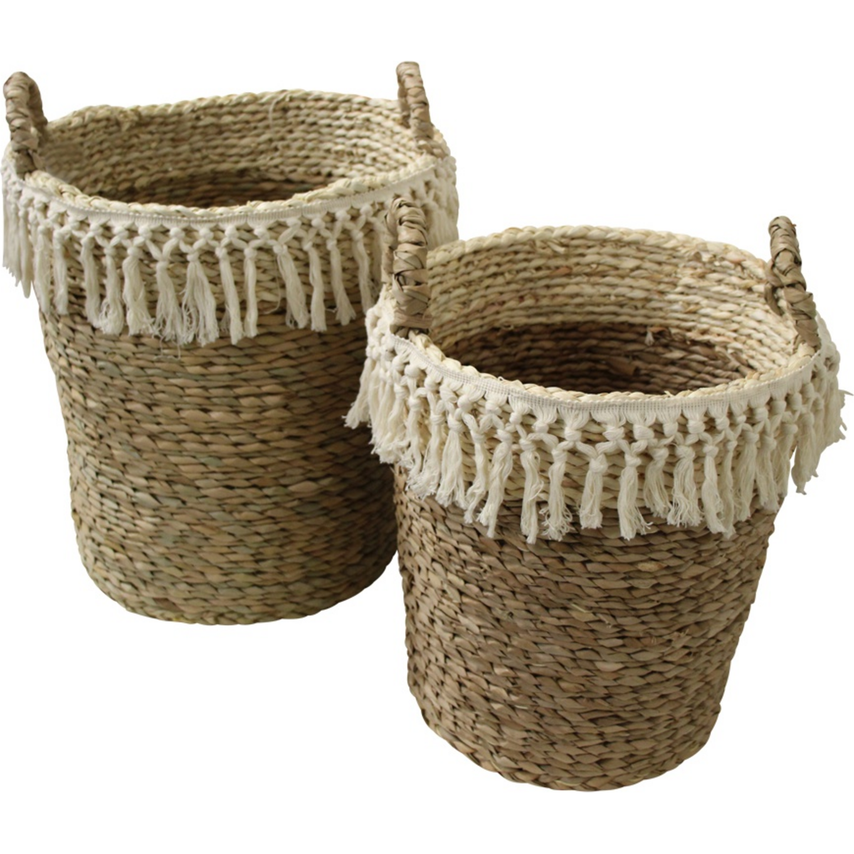Be it in the boot of your car or the kitchen where you would like to place the fresh pick from the garden. Or in the children 's room where the toddler's little toys need to be kept within reach and yet tidily-there is always the need for a set of such tubs that can be used for keeping all kinds of things. Made from seagrass and left in its most natural shade, the tubs are 40 cm in large and 35 cm in the small one and have a tapering shape with smallish round base, the handle son the sides help lift theme easily especially helpful when filled to the brim. The cotton made lace trim add a delightful detail much I keeping with its farm fresh and cottage kind of appeal. The weave is sturdy and will with stand the weight even if full right to the top. Use it for all and sundry storage-maybe to keep fresh laundry or use them like organizers in the children's room. Keep them next to the couch with throws and blankets for that chilly evening.