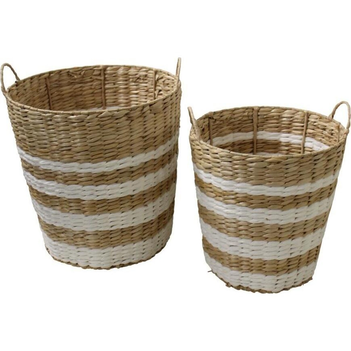 Add the finest quality seagrass made baskets to your collection of organizers at home and say goodbye to worrisome clutter. There will always be those things at home that are forever in need of some place t settle down in for some time and look distressing when they lie around. Give your home the option of such baskets that can in jiffy help you clear up a lot of stray things lying around - especially useful when you have kids who need many a little niches to keep away their treasures, use this in the kitchen or in the children's room for school supplies, or simply in your room for your collection of wool and knitting creations - there could be so many ways to use them! Made from natural seagrass and woven with great expertise they come with the promise of durability and style. The neutral colour with white stripes gives them a modern appeal. The two handles built along the top rim makes them easy to grip. The shape is contemporary and nestable thus making them big help around your spaces.