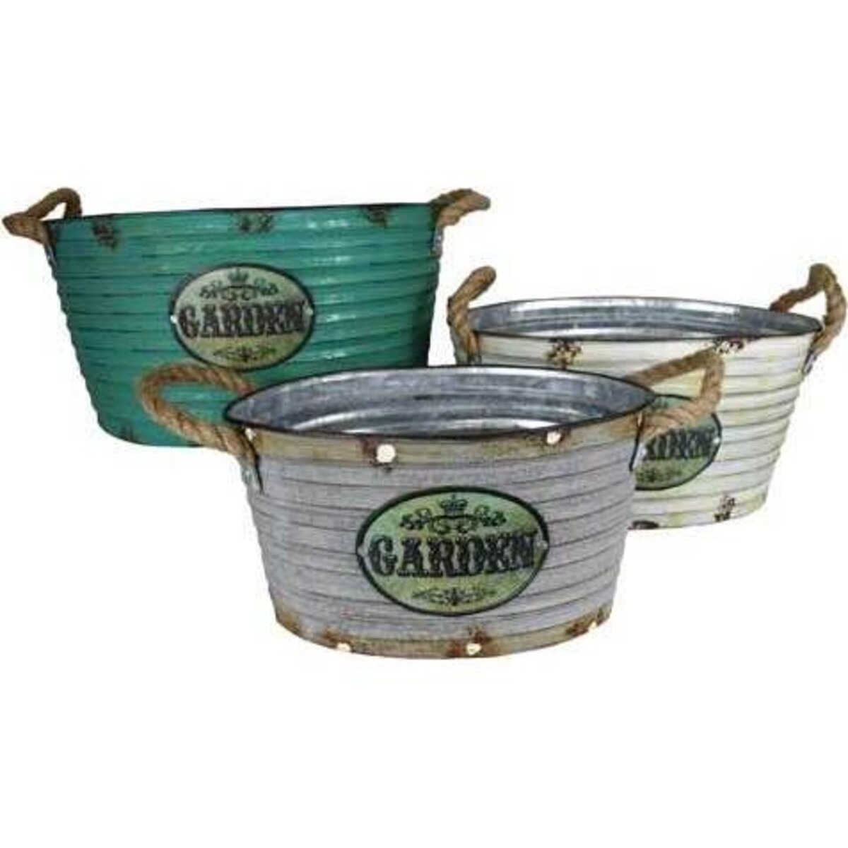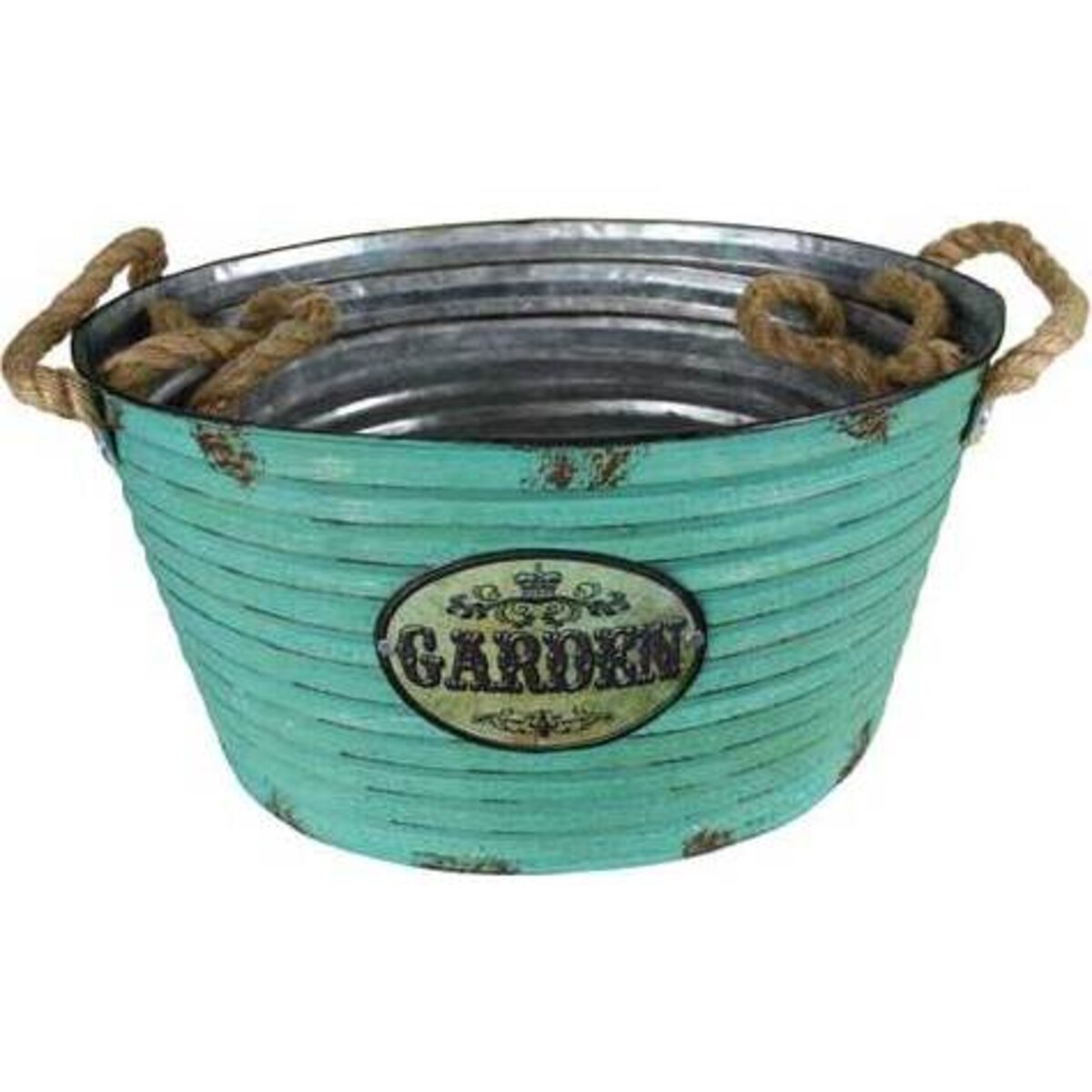 The metal planters look vintage with their rusting and peeling paint effect. The rivets and the handles show the kind of vintage look all the more clearly. The handles on the planters make it rather convenient to shift them around and place them as and where one pleases. The mouths of the planters are wide - about 45 cm in the largest allowing one to place a couple of plants in a combination if one wants. Thus it would in fact be possible to combine two or three types of ferns or flowering plants with some fern. The three varied sizes allow one to store the planters one inside the other with ease and thus save on space. The metal body is sturdy and yet not too heavy .The blue, white and the natural metal colour of the tubs is truly charming and a period look emerges with its rust marks and the chipped paint. The set may be used to create a tiered look.