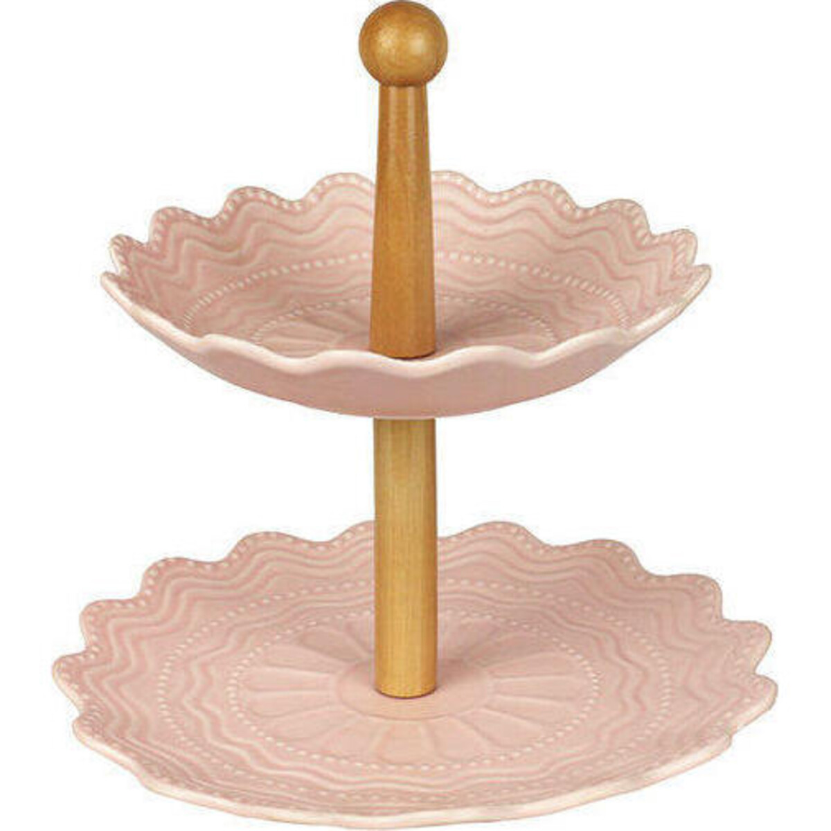 God food deserve to be displayed well and if you have had a back breaking task of baking all day prior so as to make your dinner or high tea something to be remembered, surely your tarts, cakes or muffins need to be displayed with as much heart. Here is a two - tiered tray that has been handmade to a perfect high glaze. The scalloped edges, the dainty design embossed all over and the varying size and depth of the plates makes them give the piece so much in terms of great looks and usability. The upper tier has a deeper plate which allows the food on it to rest securely tilting towards the centre. Could be used for serving pastries, tarts, cookies, macaroons and such savouries. The lower tray has a similar design in scalloped edges but has a flatter design to give stability to the 26 - cm diameter of the twin level tray. Perfect for making your table arrangement reach a certain high in style and presentation. The balance of course is also because of the central wooden coloured pillar that makes the tiered tray easy to pick up and place.