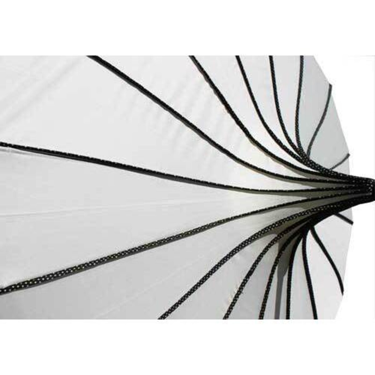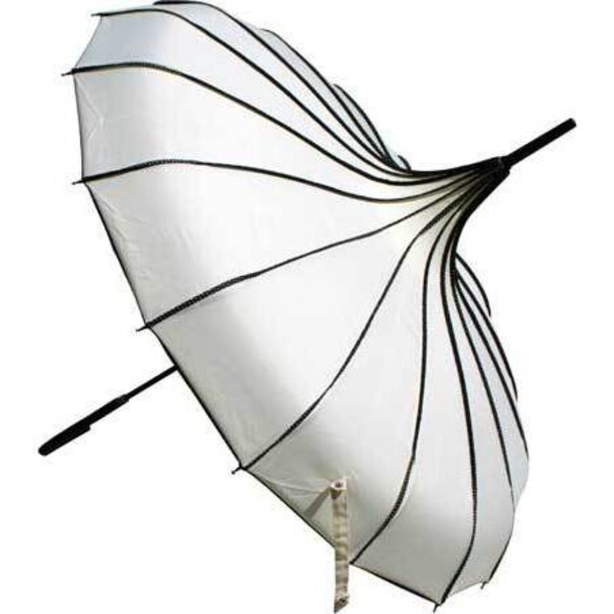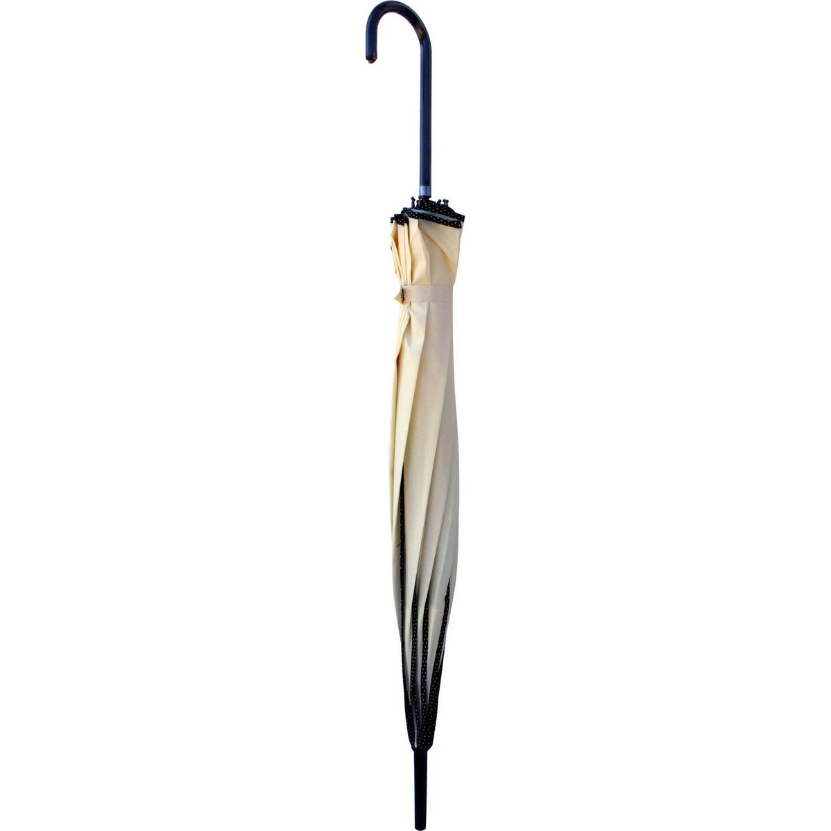 This cream coloured umbrella features black trim and an exaggerated pointed top and hooked handle. It's the umbrella that can keep you dry and serve as the perfect accessory you never knew you needed. Considering how easy it folds up in a compact fashion, you can carry it with you at the first sign of inclement weather. It goes well with every outfit you could put on and its interesting look will have everyone asking where they can get their own.