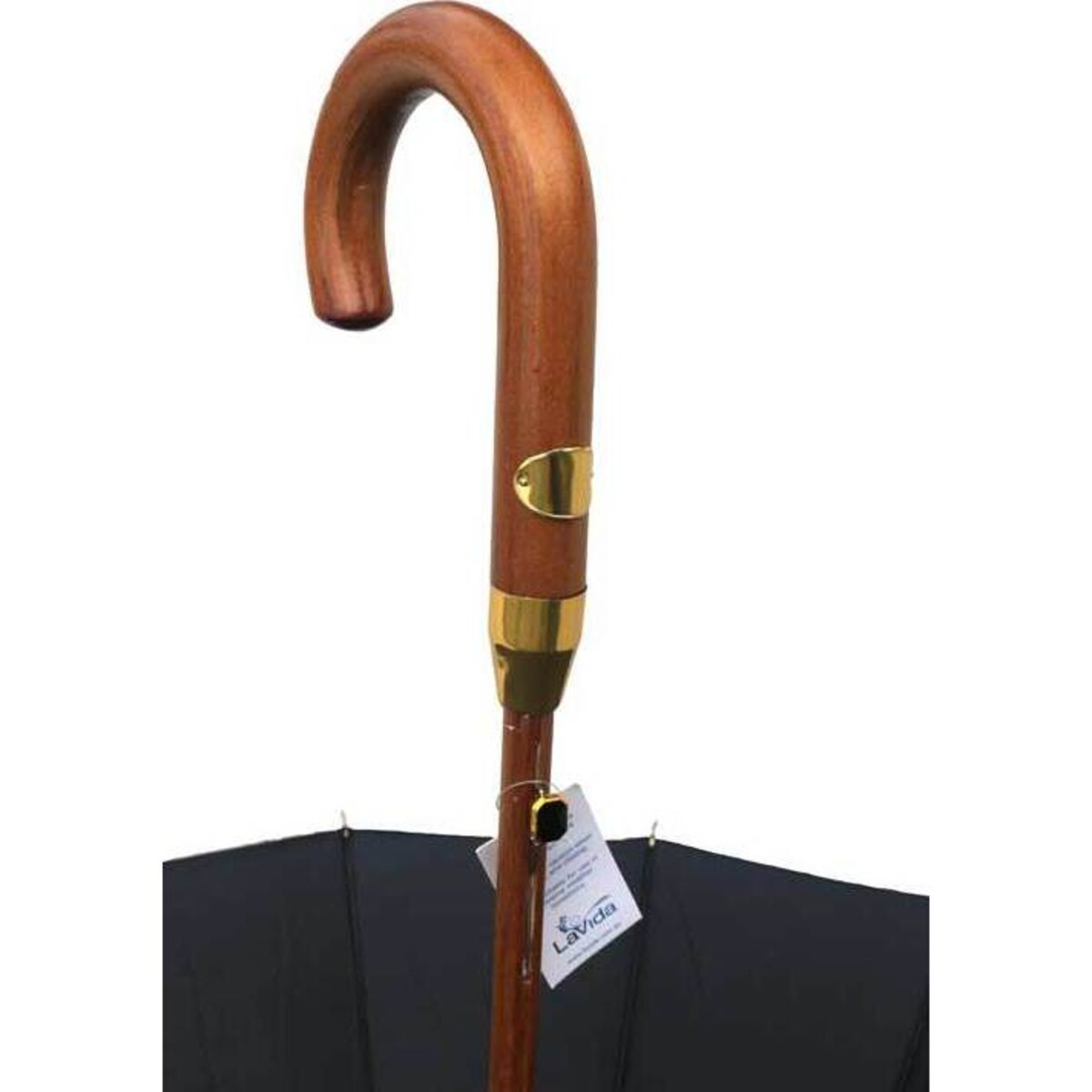 An umbrella is pretty standard for everyone to own. Rainy days can happen at any moment and it is important that you keep yourself from being soaking wet. In the same token, you can also use an umbrella to block the sun on extremely hot days as well. The design of this umbrella is fitting for those who like to have a minimalistic style. This umbrella has an all black colour exterior with a sophisticated brown/wooden coloured handle. What makes this umbrella even better is the elegant gold trim that is fitting for a gentleman to display his style of refinement.