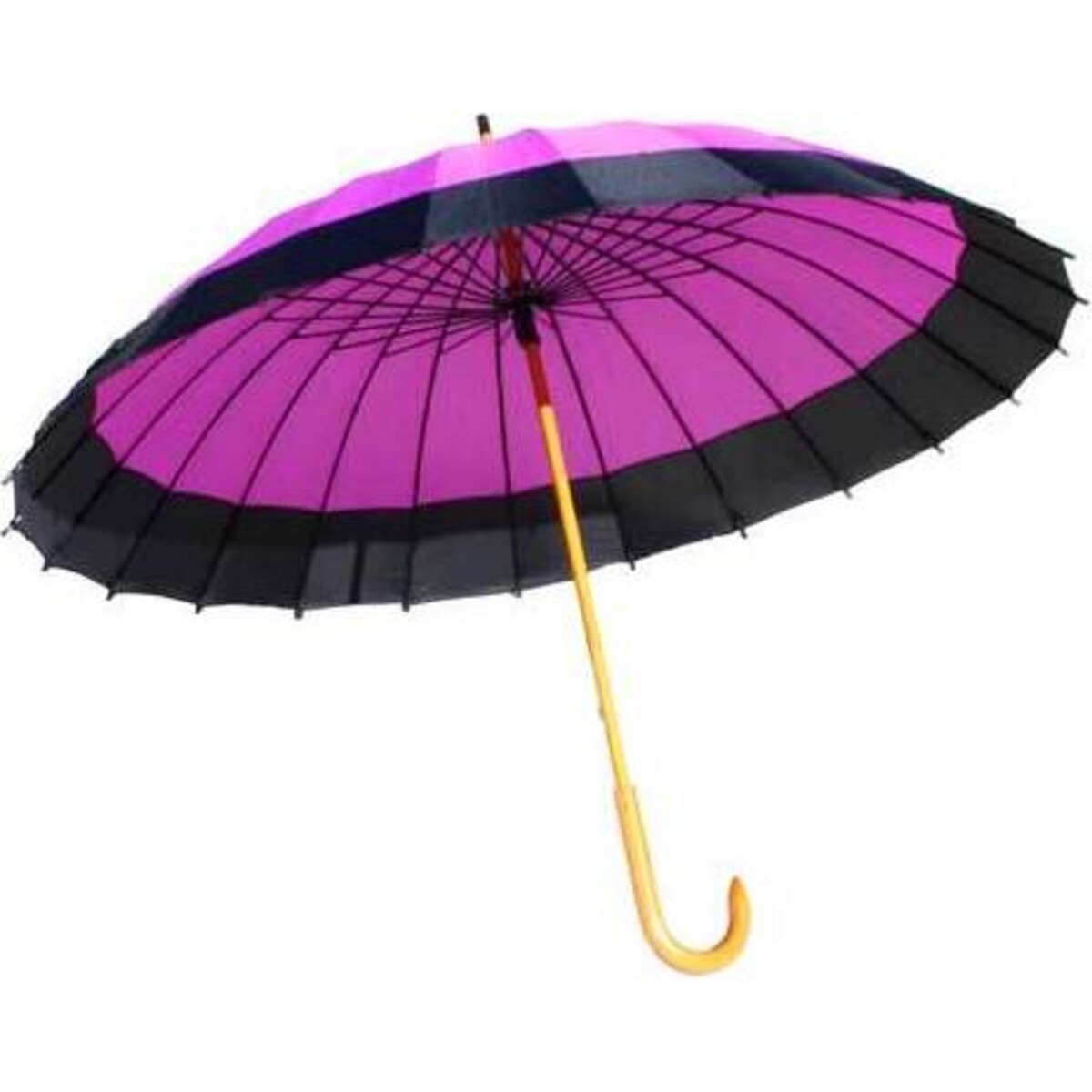 Umbrella Purple Top is an attention - grabbing umbrella that comprises of a purple top made using waterproof fabric, having a black stripe covering its entire circumference at the base. This product also features a wooden handle, connected onto the top using metallic wares. One can acquire this product for use when venturing outdoors during conditions of adverse weather. It includes both humid and wet conditions, where it offers much - needed shelter to the user. In addition, the resplendent colour used looks classy and can also be helpful when going on an excursion to areas of poor visibility in a team.