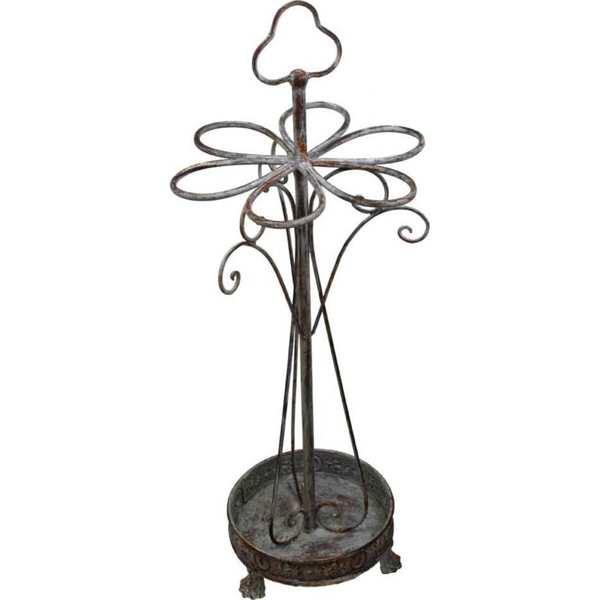 This metal designed umbrella stand has many useful features, including space for six umbrellas neatly created with looped metal rings, the handle on top that allows easy carrying and placement in any part of the home or office one desires to place it in, and of course its very thoughtfully created design that makes it look as appealing loaded with umbrellas as without. The framework in metal is very stable, the legs neatly designed with a bracket provided at the base on which the tip of umbrellas placed in it will be resting. The tall stand has a neat curved metal design that runs along the stem of the main stand and legs that are ornate and so very pretty. While the rest of the body of the stand may be hidden from sight most of the time, it's the top and the legs which will be always visible and they have been given that extra bit of attention .Another marvellous feature is the manner in which arched metal separators keep two umbrellas close together thus disallowing swinging to the side and spoiling the neat arrangement and thus also creating segregation of space for all .A useful element in the hallway and entrances, this is one umbrella stand that will looks as pretty standing alone as when loaded with its consignment.