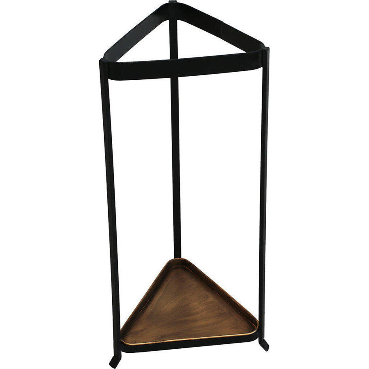 Umbrellas beyond a doubt are an all - weather essential and there are as many of them in your home as there are members. Nobody would like to have them cluttering up cupboard spaces or seeing them plopping down when they are simply made to stand against the wall. Give your most important accessory a place of dignity - use this wrought iron and wood made stand that allows ample space for several of them. The base will allow the umbrella to balance well while the frame will give them adequate support. Simple and elegant, the stand is a picture of minimalism so very suited for modern homes. Will take very little space in the corner. Sturdy features and the combination of simple black metal with wood always looks stunning. The height of the stand is 60 cm and its has a triangular faceted shape with grids on the sides so as to give support.