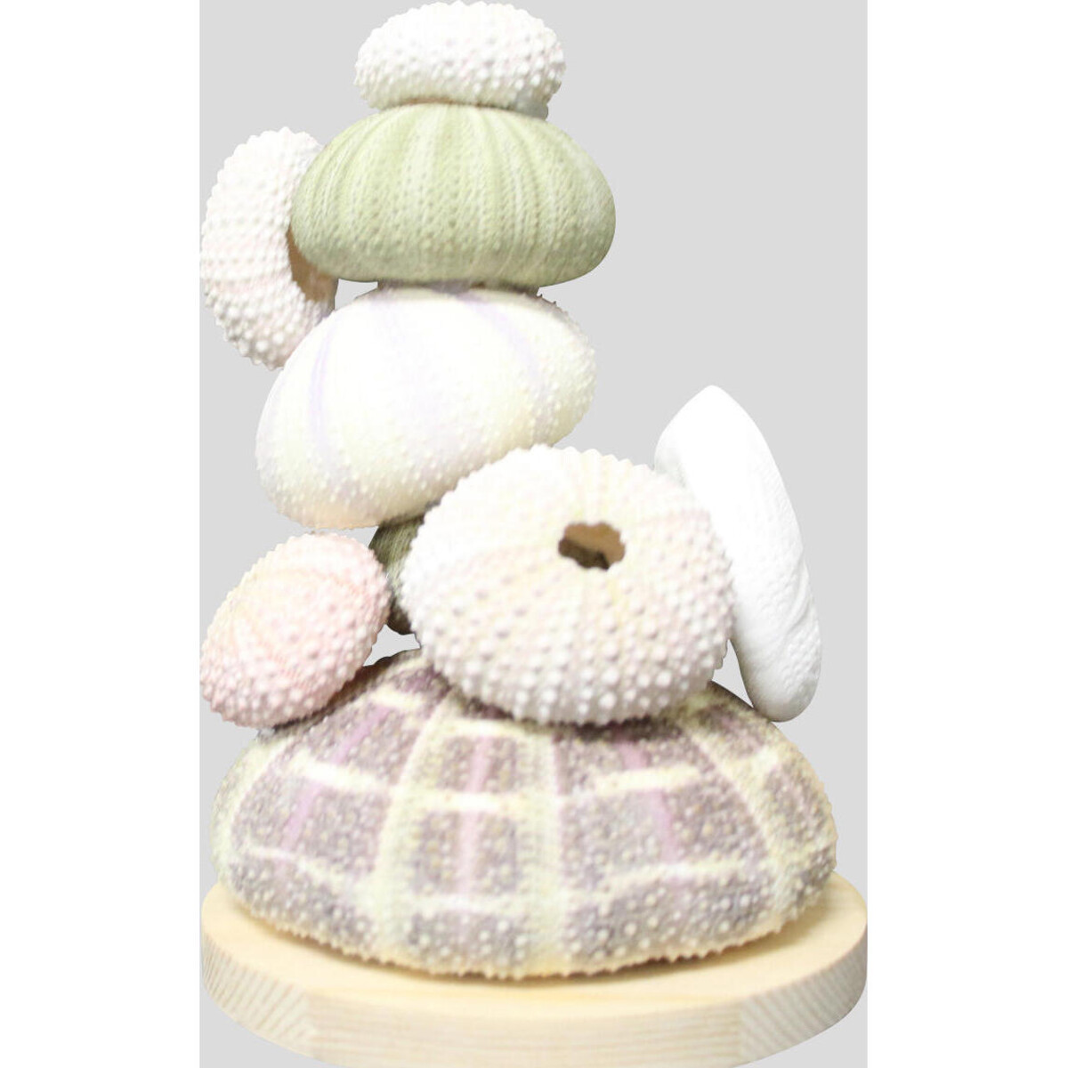 The colours of the urchin shells are simply gorgeous - as if just picked off from the shore, they each must have till some time back belonged to the seas and the ocean. This vertical layering of sea urchin shells is truly a spectacular in its starkness and unassuming beauty. The prickly spines on the surface of the shells - the subtle colours - each varied in size as well, makes it an interesting addition to the console or any such space that could do with a touch of an artefact. The shells have been glued together firmly albeit roughly on atop another. A large striped in grey shell makes up the lowermost base that is settled on to a round base made of wood. The light - coloured wooden base adds a touch of elegance as well. The smaller stacked shells are on top and thus the look of a tower. The total height of this shell sculpture is all of 16 cm. Place it under a lamp to bring out the beauty of its soft colours and hues a its rough spiny exterior.