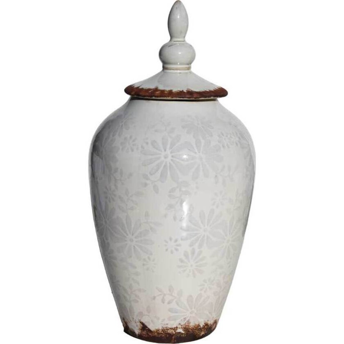 This white urn features a lovely floral design and brown detailing along the bottom edge of the pointed lid as well as on the base of the body. While this item is lovely to display as is, you can use it in a variety of other ways as well, such as a storage space for small items you don't want guests to see, and as a vase if you remove the lid. Isn't it great when such a fabulous piece is functional as well as stunning?