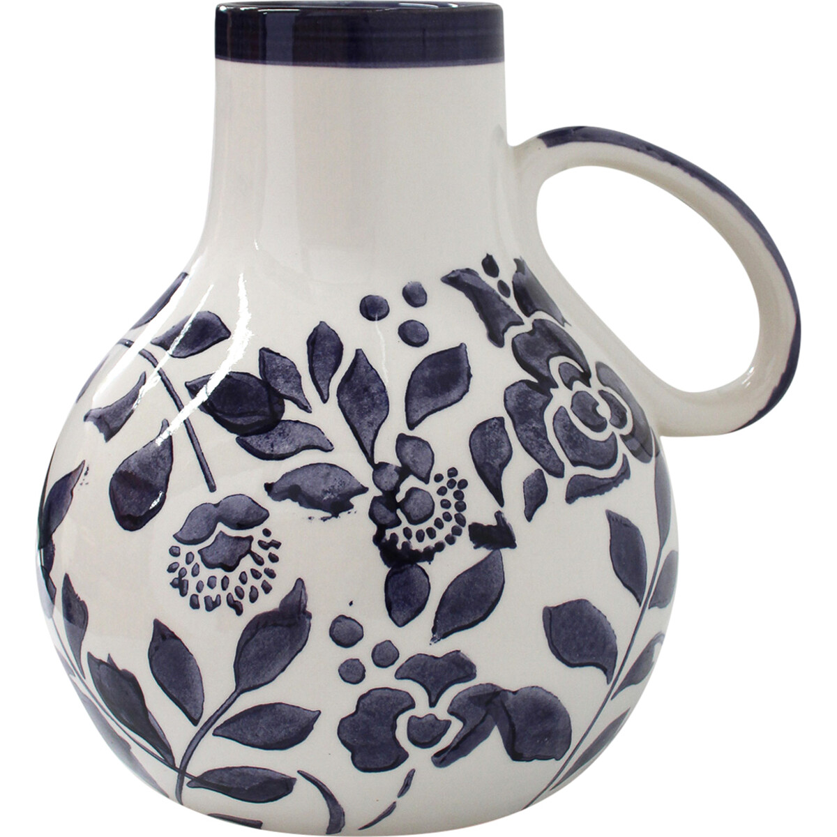 Made using the perfect kiln firing method-this urn has a white body with blue flowers painted al across- not too fine yet dark and intense enough to give it this fresh kind of lift. And from fine quality ceramic that ca be seen in the rich sheen on the surface-the urn is very close to typical Dutch pottery from Delft and a mix with the blue pottery from India and yet modern in its flair. Could be used for simple display on shelves or table tops or also be used to display flowers. The handle makes it easy to lift and carry and thus could be as a jug. Mere 25 cm tall, its rounded base is softly curving and that adds to its utterly charming look. Sits on small round base that gets balanced as the stem of the jug too is slim and the mouth small. A wonderful means to infuse a cottage and artsy kind of charm to your displays.