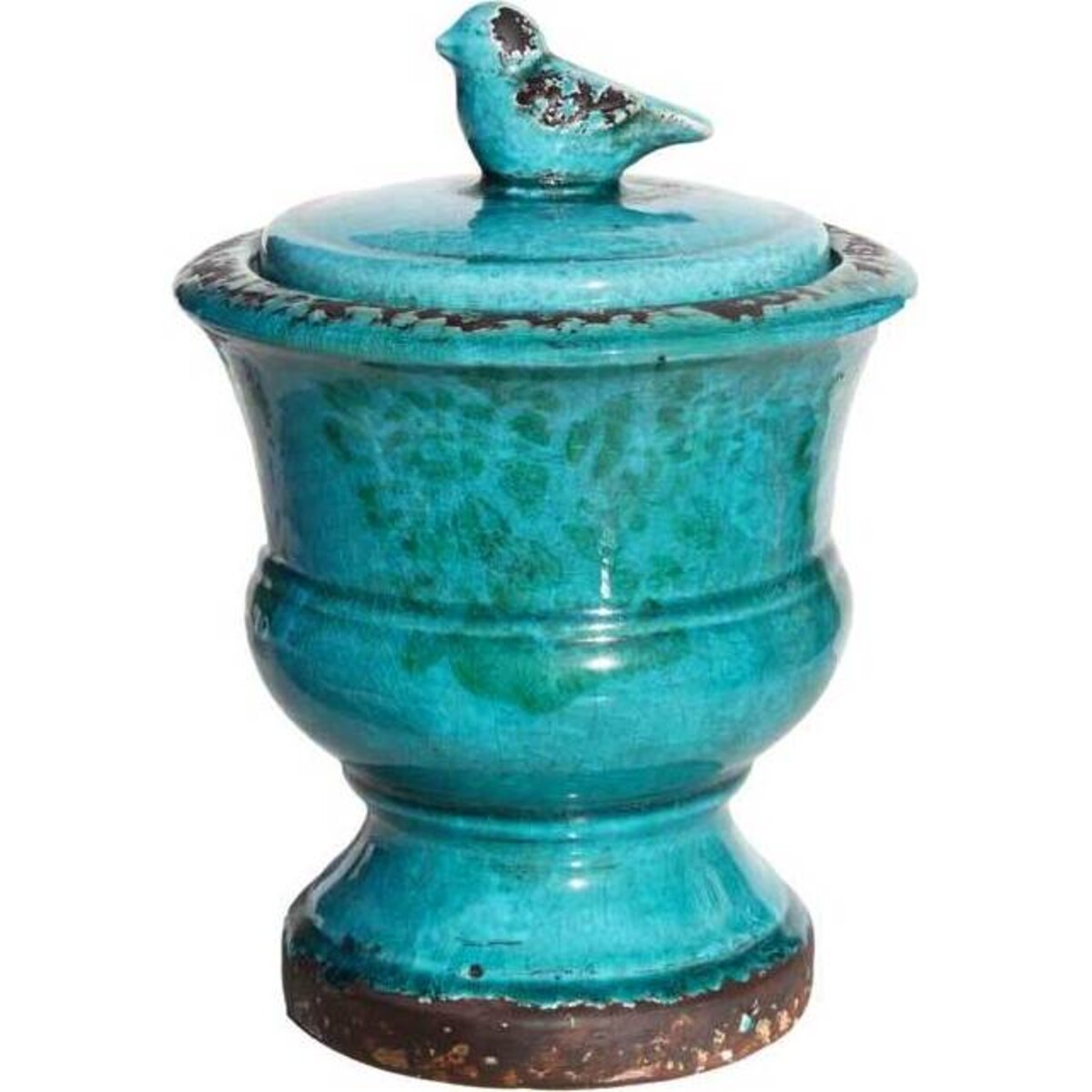 This fabulous piece is just what you need to add colour to your space without going overboard. The turquoise urn features a green floral design throughout and a little bird on top of the lid, as well as dark brown detailing on the bottom, on the bird, and on the lid. It's a piece that appears to be right from the shelves of an antique store, just without the heavy price tag. While you can display the urn as is, you can also use it as storage space and fill it with small items you don't want seen. You'll simply love how much it brightens any room.