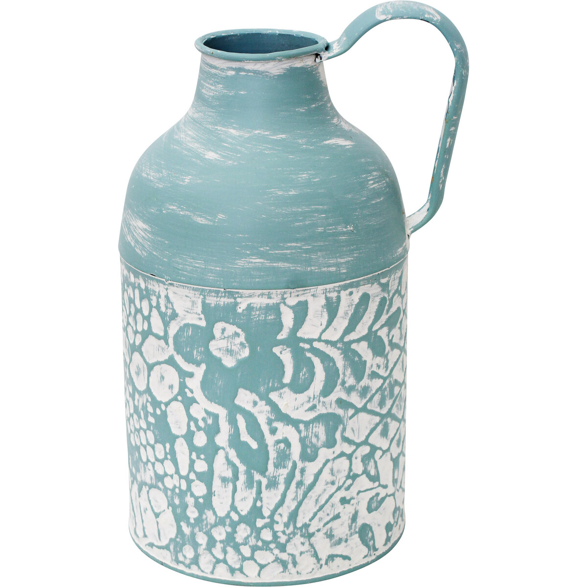 This Urn Peony Blue is made in a visually appealing design which is characterised by a small, round opening which leads to a downward broadening neck which in turn leads to a large, cylindrical body that is tall and visually conspicuous. It also comes with a stylish handle which is both functional in providing firm grip as well as serving as a showy, decoratively stylish handles. The upper part of this metallic urn is painted lightly in maya shade of blue while the lower part equally has a maya blue background but with several white washed patterned painting.