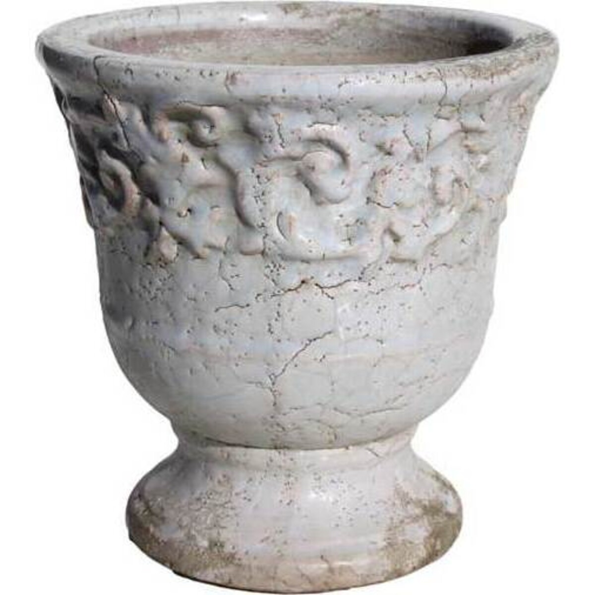 This off-white vase features a rounded base with a carved swirl design around the top. It has some slight discolouration and wear to give it a weathered appearance, as if it's been used and well-loved for years. Thanks to its design and colouring, it can complement any beautiful bouquet you put in it. While its ideal to use for its intended purpose, you can also display it as is or use it as a storage space for small items you want kept out of view. It makes a great gift for yourself or for a gardening aficionado in your life.
