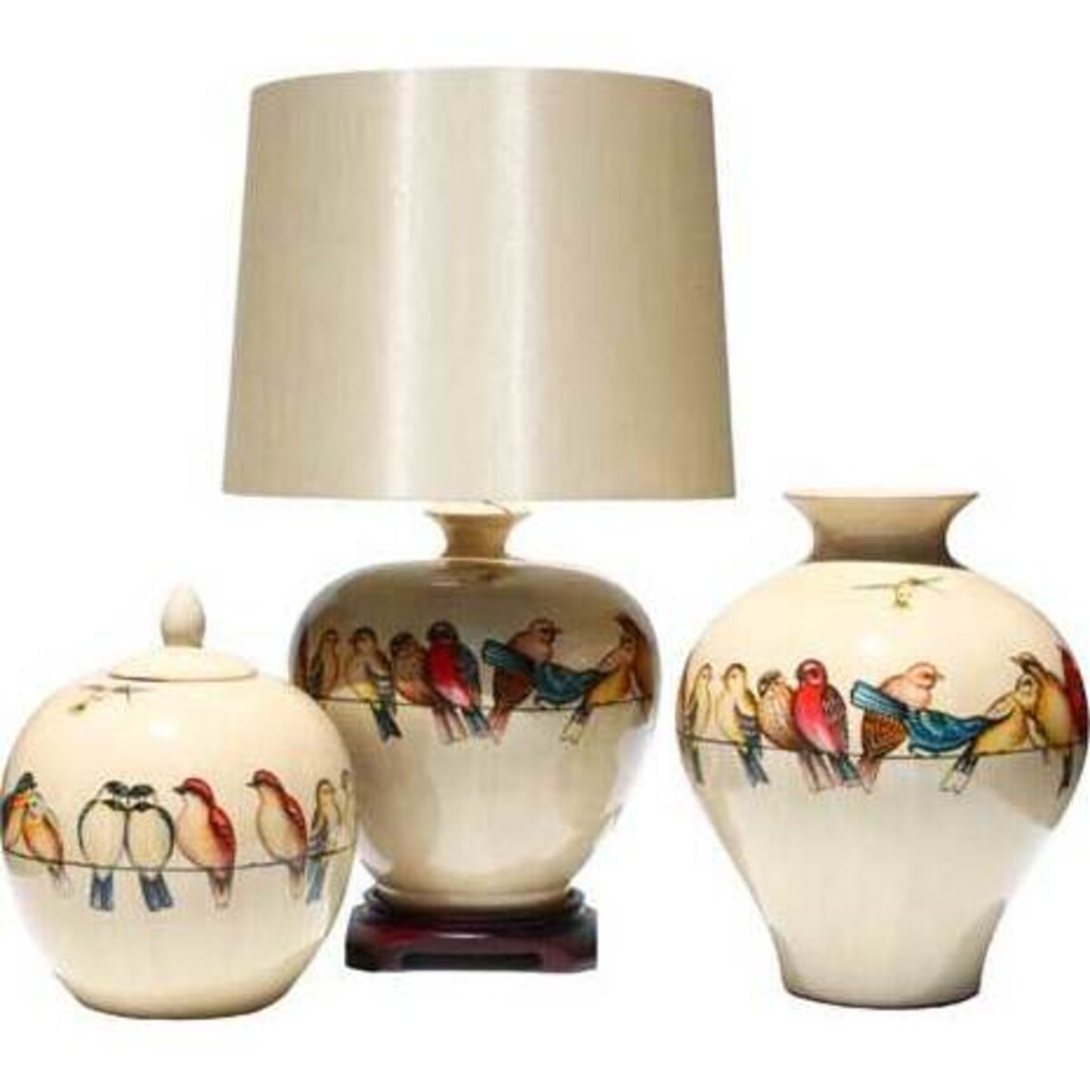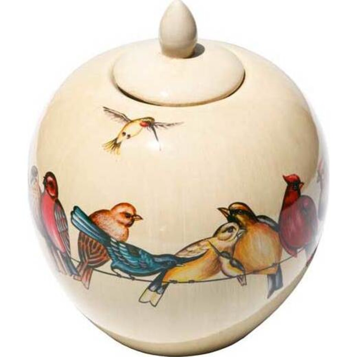 This small bird charla vase is part of a three piece set that includes this vase, a similar tall vase and a stunning looking lamp. The three items are off white in colour and feature an array of small colourful birds sitting as if on a telephone wire or a line for drying clothes. Hovering over the birds is a small but stunning humming bird, looking down on his fellow counterparts. The design triggers a smile as you imagine the gentle and soothing chatter of these birds as they discuss the day in beautiful song. All of these items have a soft finish and a clean visual texture, and work well as single units or as part of a set. This vase has a thick porcelain lid with an easy to pull handle that adds a look of distinction to the top of this vase. This piece is perfect for potpourri or storing small objects in a dignified way.