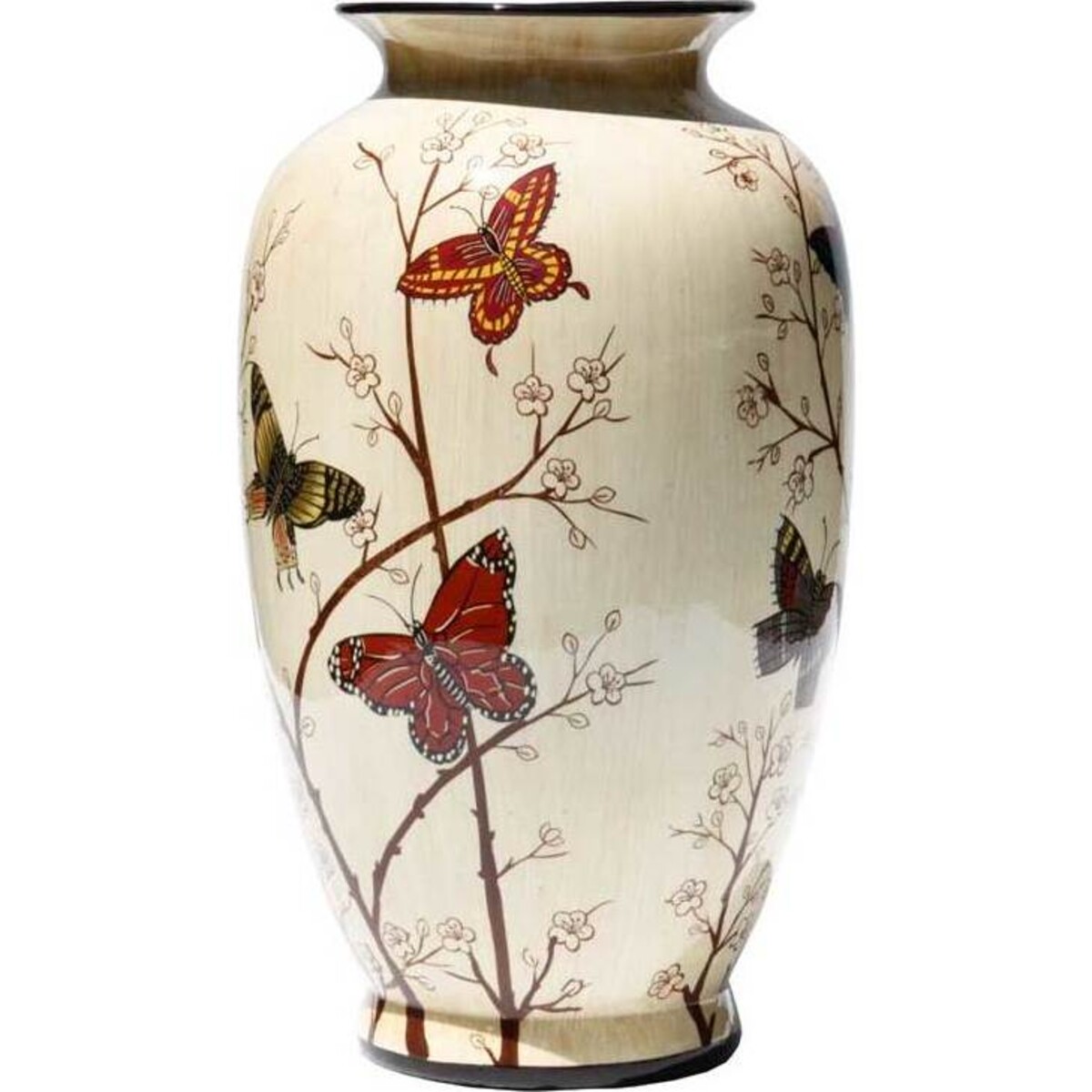 The blossom butterfly vase is just one piece in a set of four items which also include a butterfly lamp, a butterfly jug vase and a butterfly bowl vase. Each of these items works very well with the others in the set but they can also be sold as impressive individual pieces. This tall, wide vase is perfect for a long stemmed floral arrangement. This off white vase features colourful and enigmatic butterflies flying and floating among the branches of cherry trees. This vase manages to be muted and colourful at the same time. The end result is a work of art that looks more like a piece of Japanese scroll art than something that would be placed on an end table. The base, lip and interior of this vase have been painted a rich black to enhance the softness of the background and the muted vibrancy of the butterflies.
